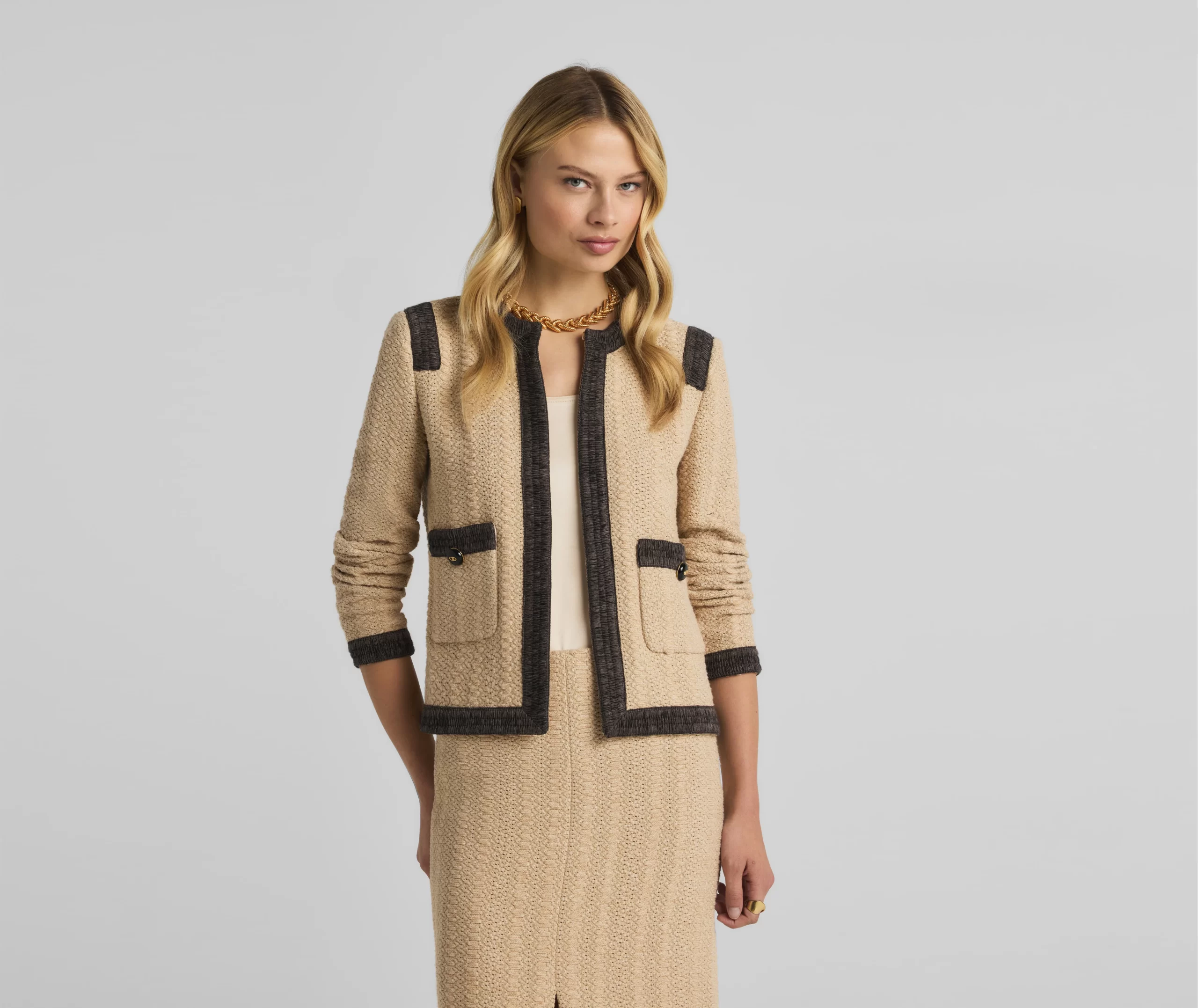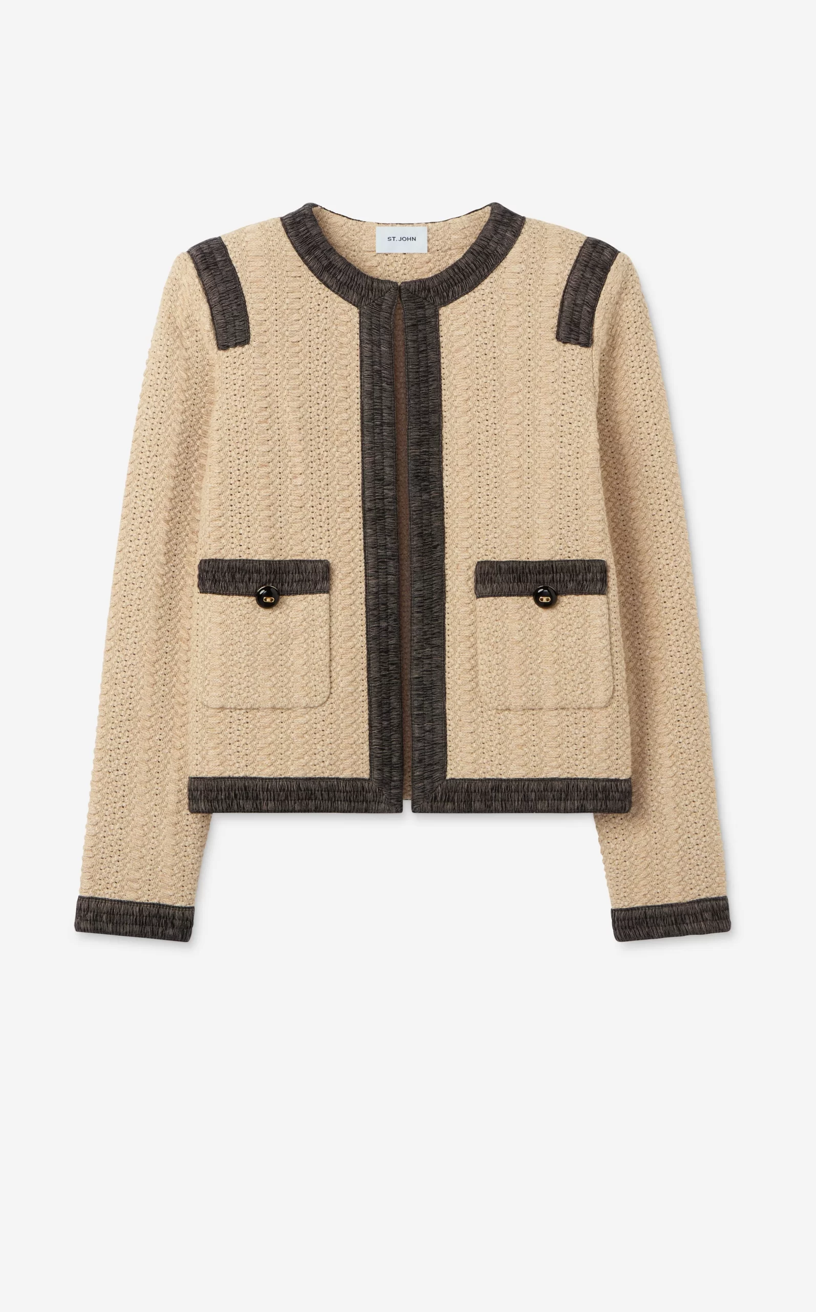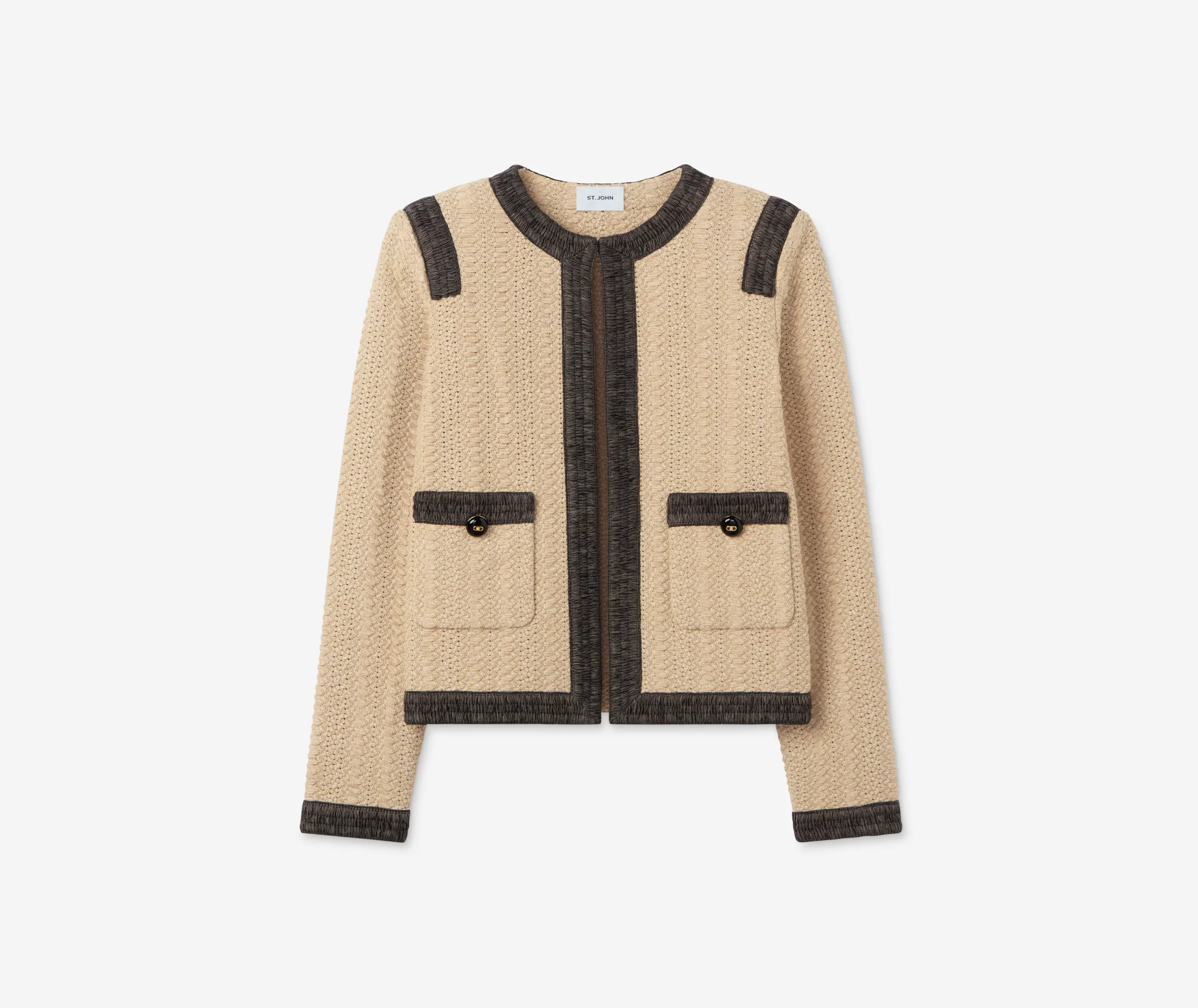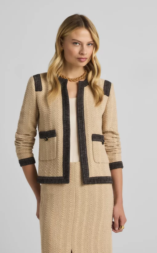 Craft turns chic in this expertly executed short, round neck jacket in an intricate basketweave knit with contrast trim accents and delicate buttons.