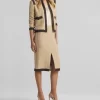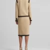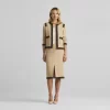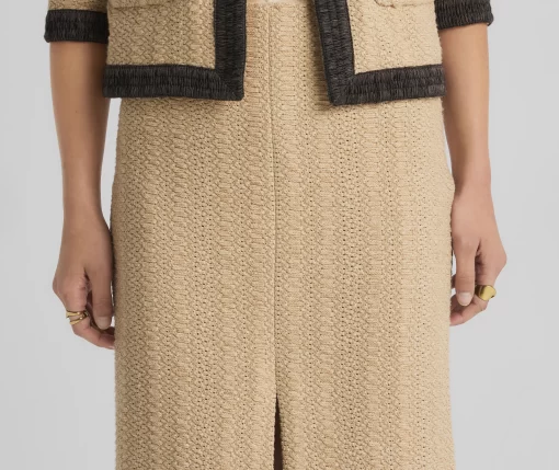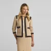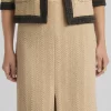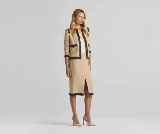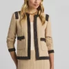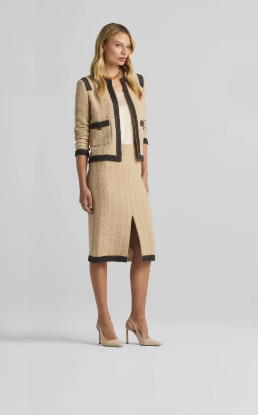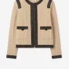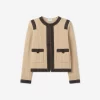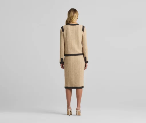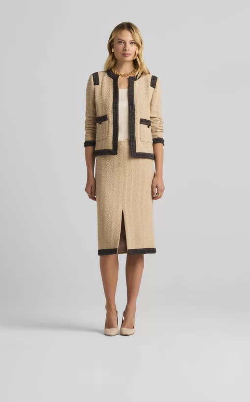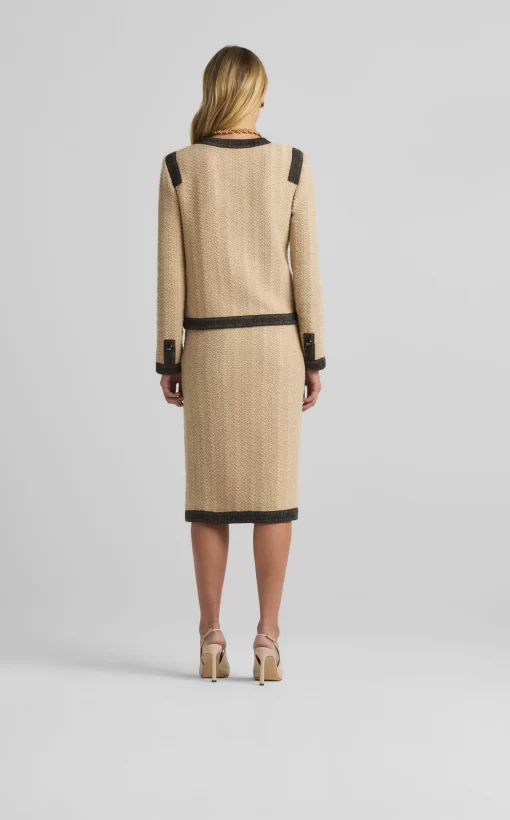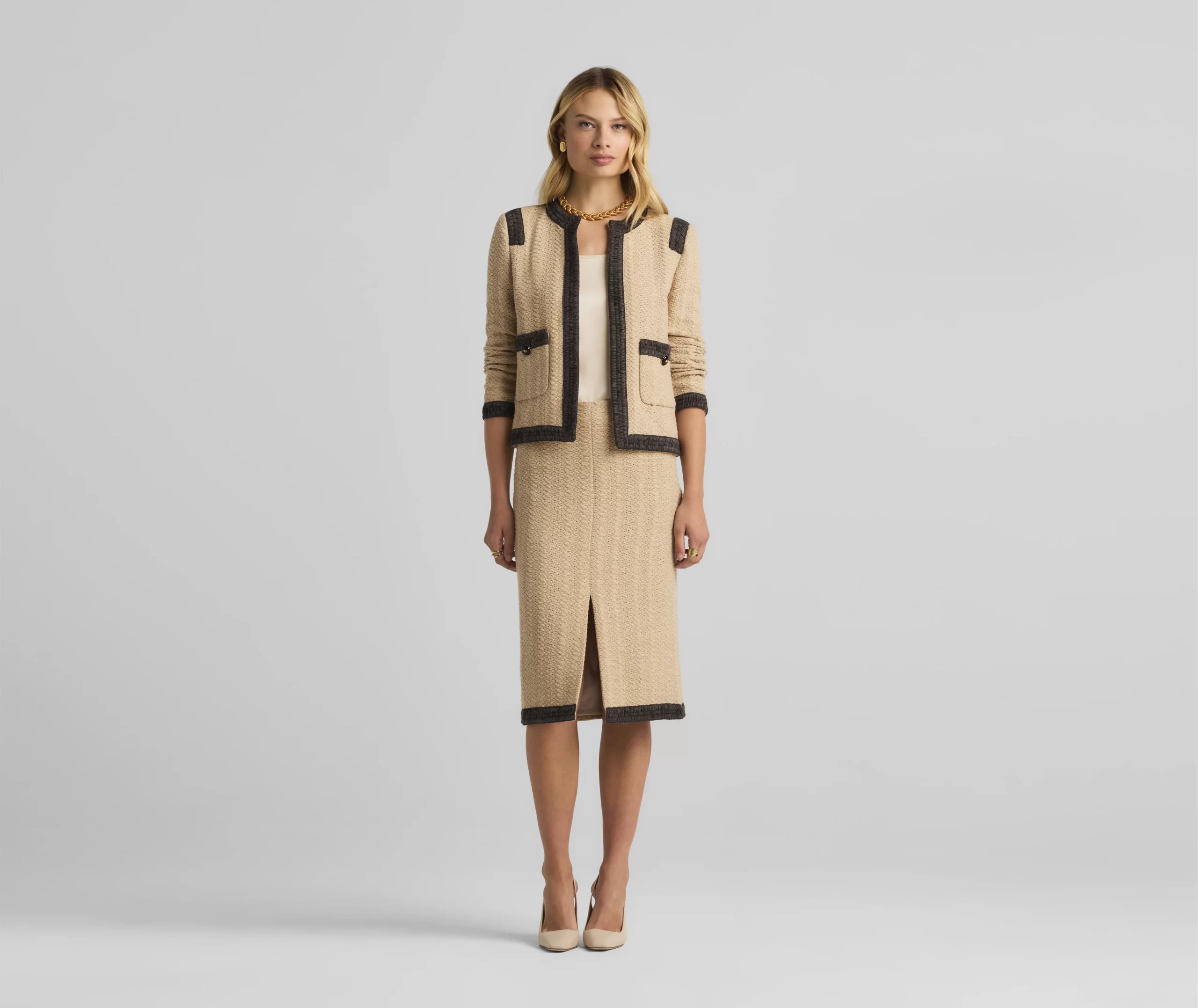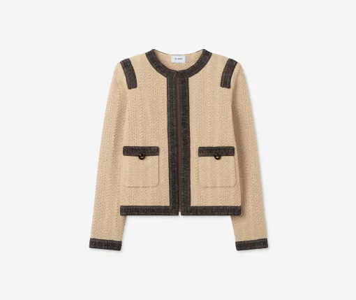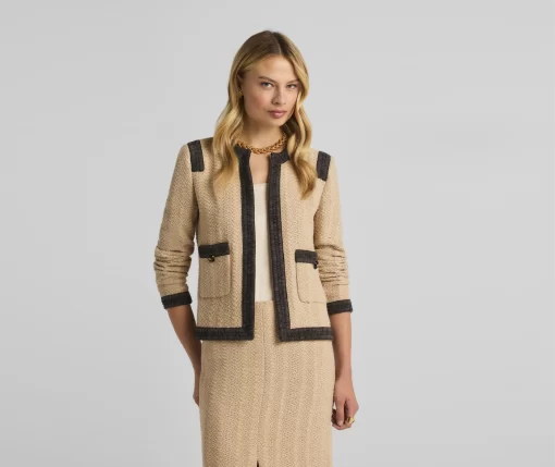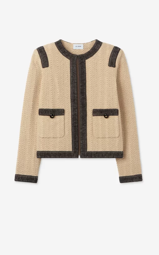 Craft turns chic in this expertly executed short, round neck jacket in an intricate basketweave knit with contrast trim accents and delicate buttons.