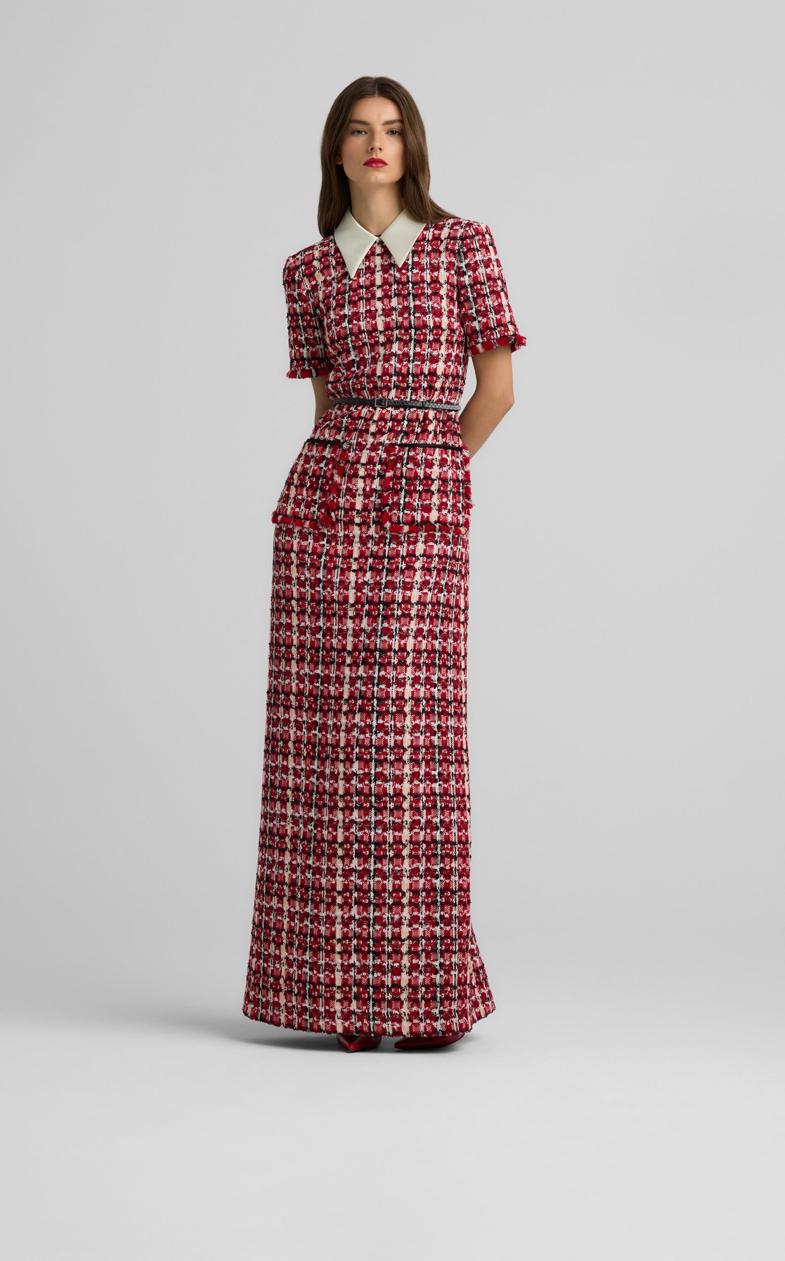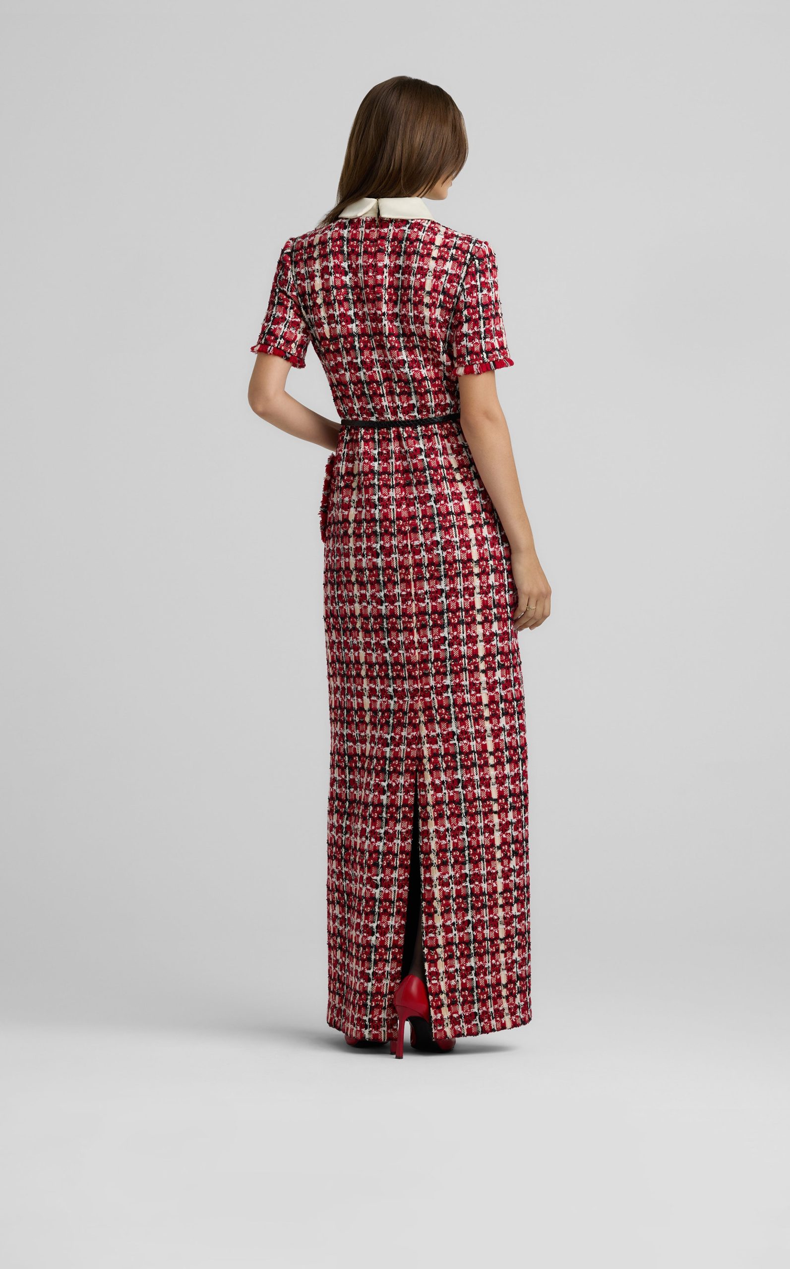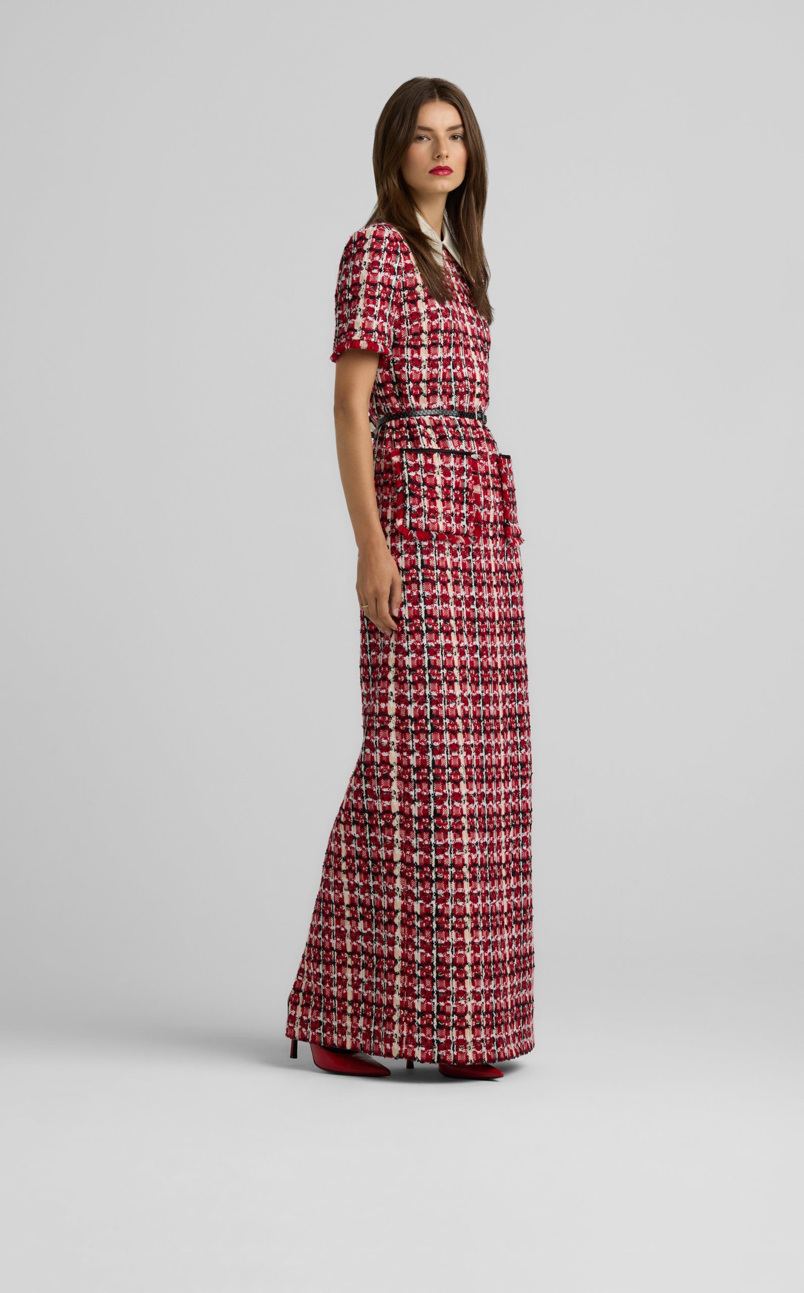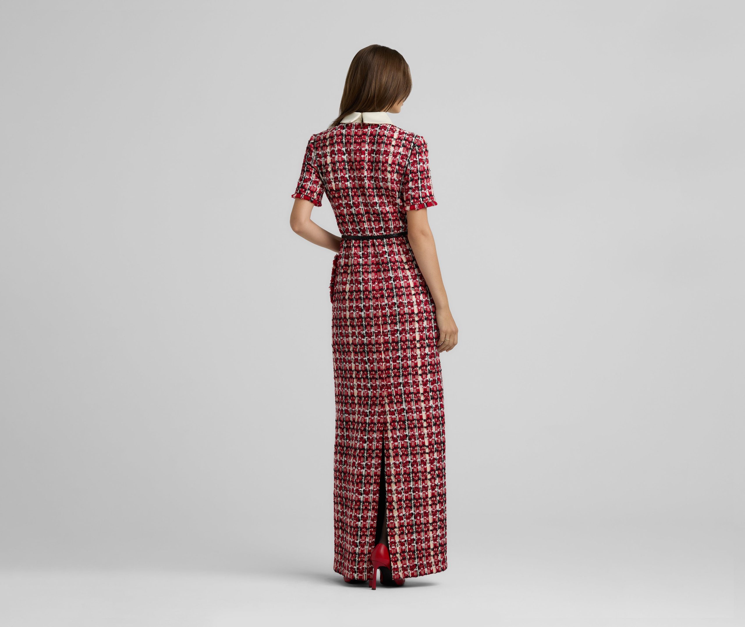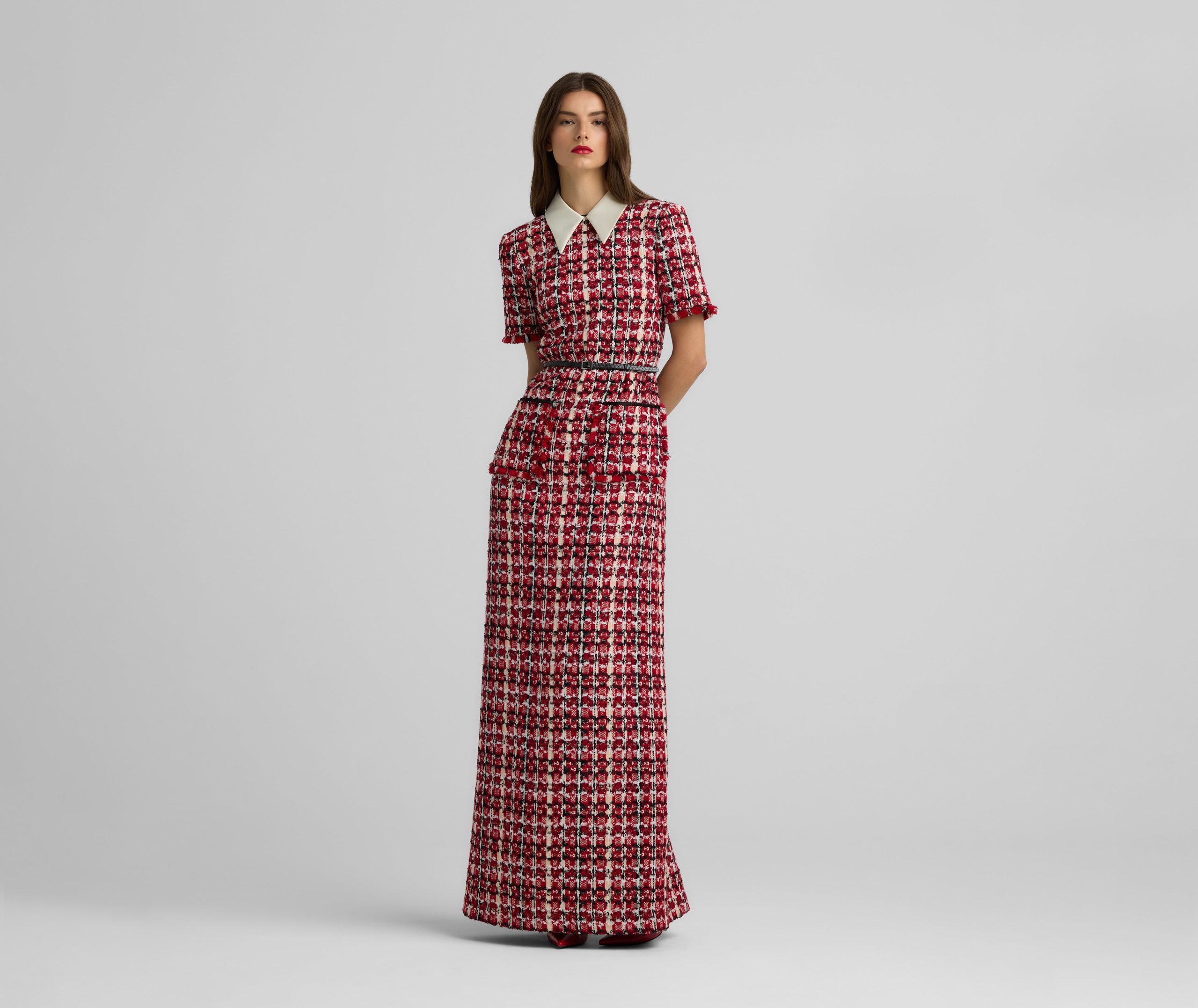 A soft plaid tweed knit dresses up for evening in this unique satin-collared short sleeve gown with patch pockets and a sophisticated straight skirt.