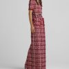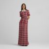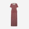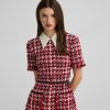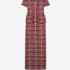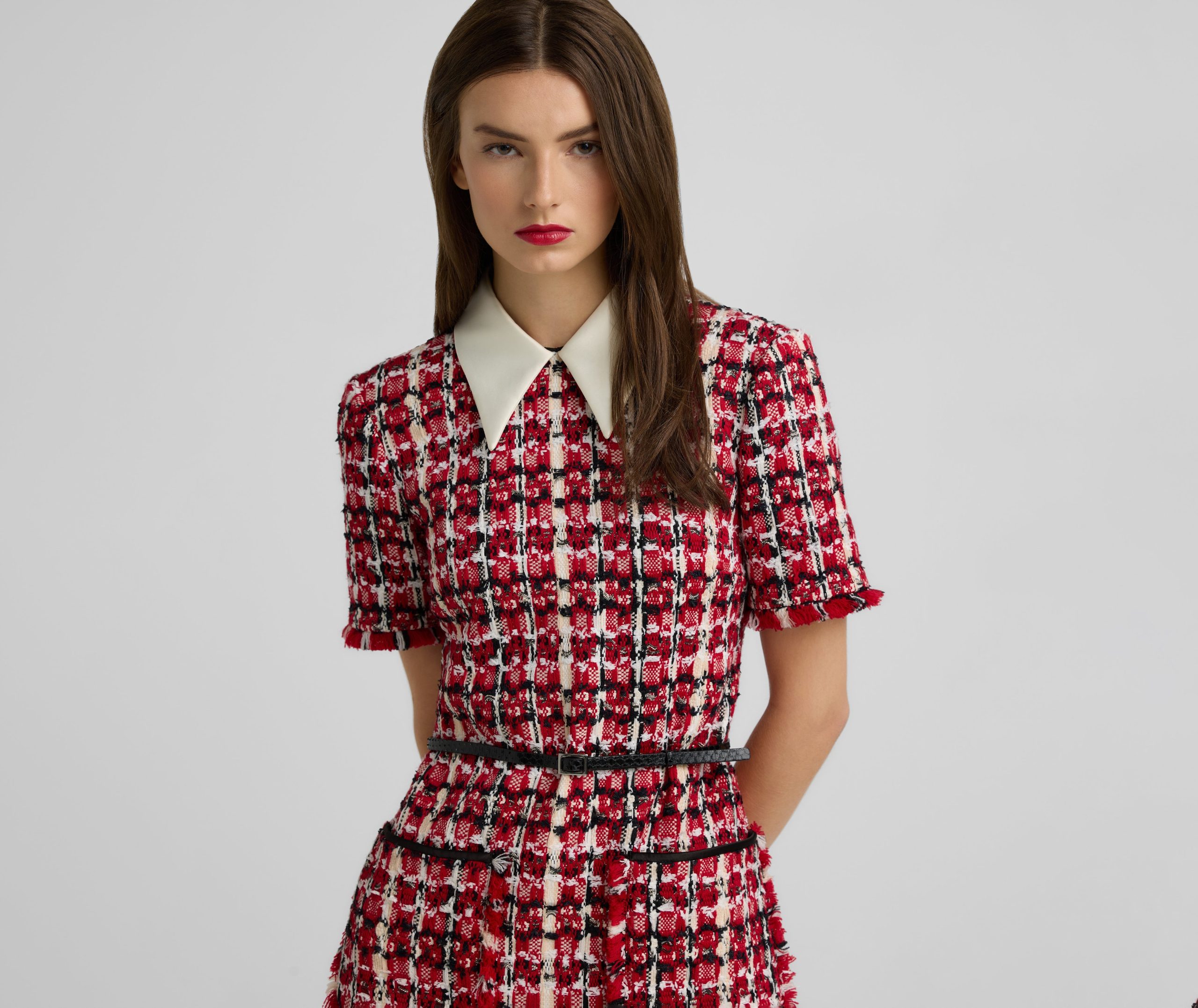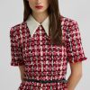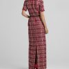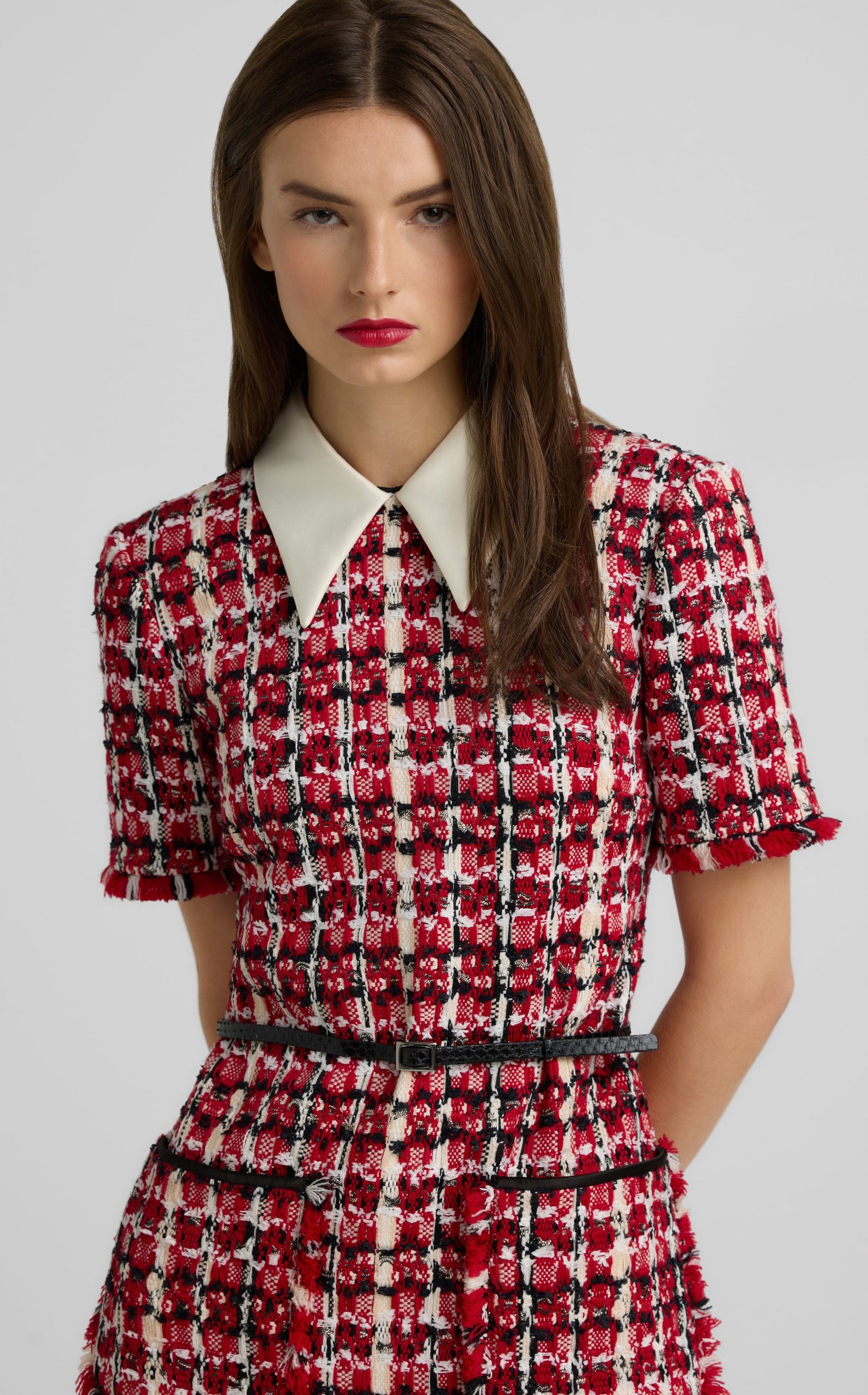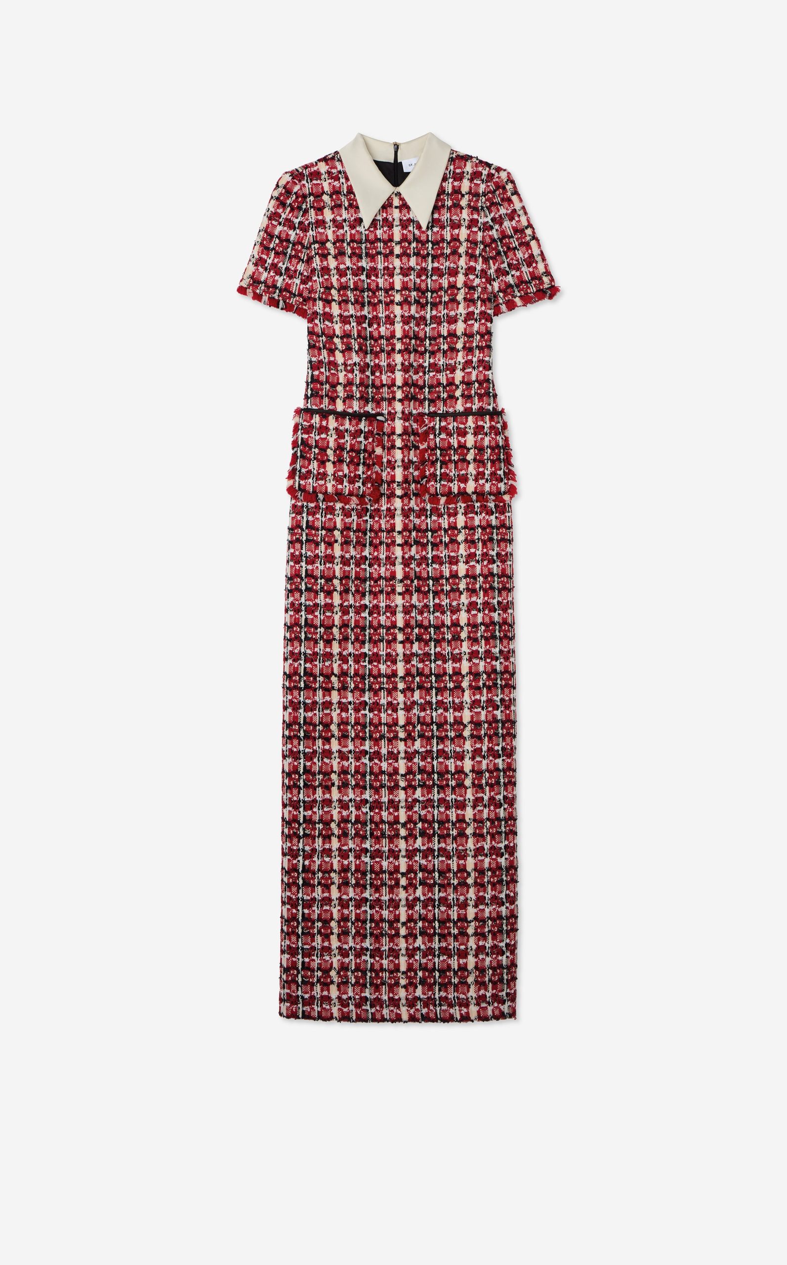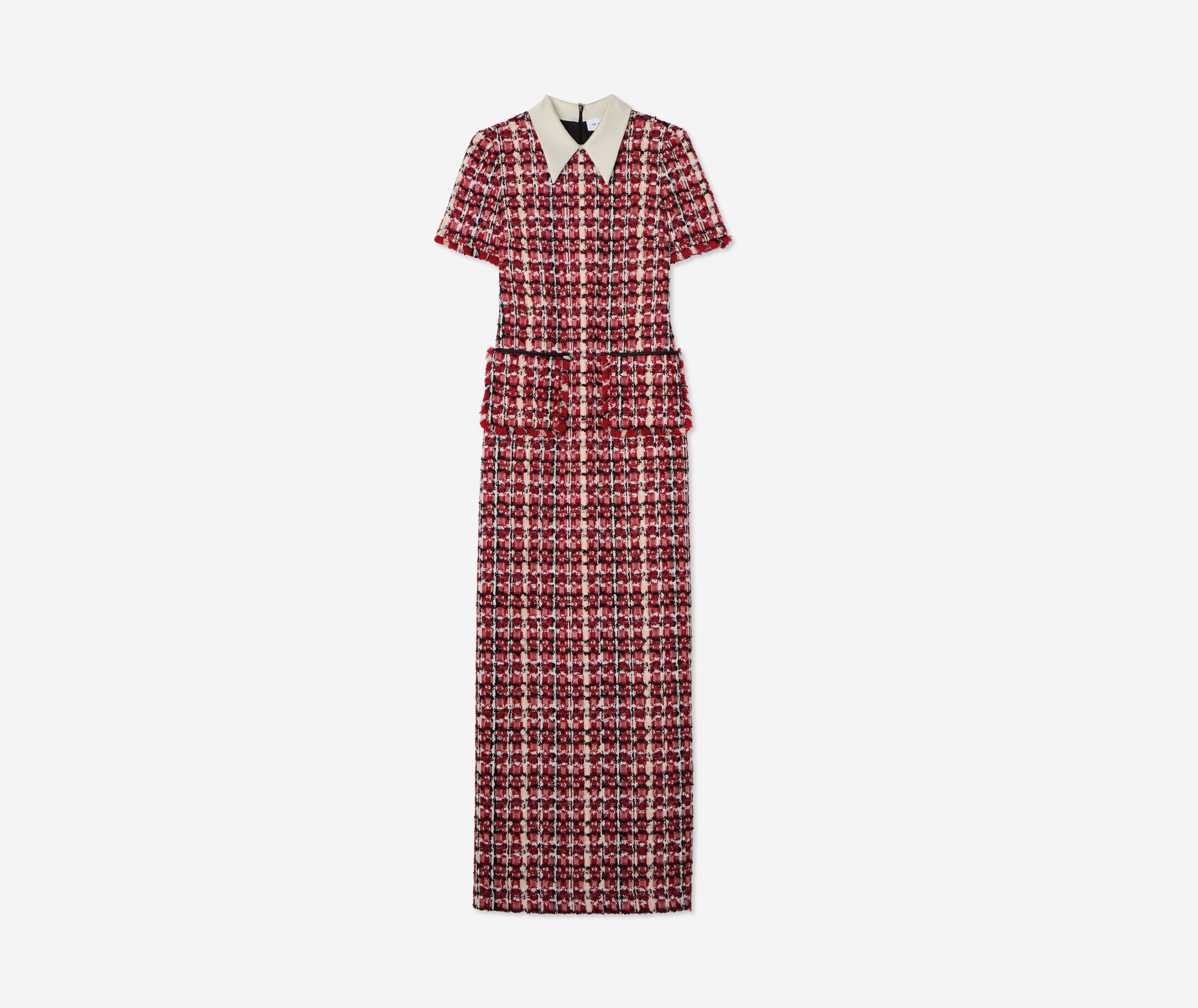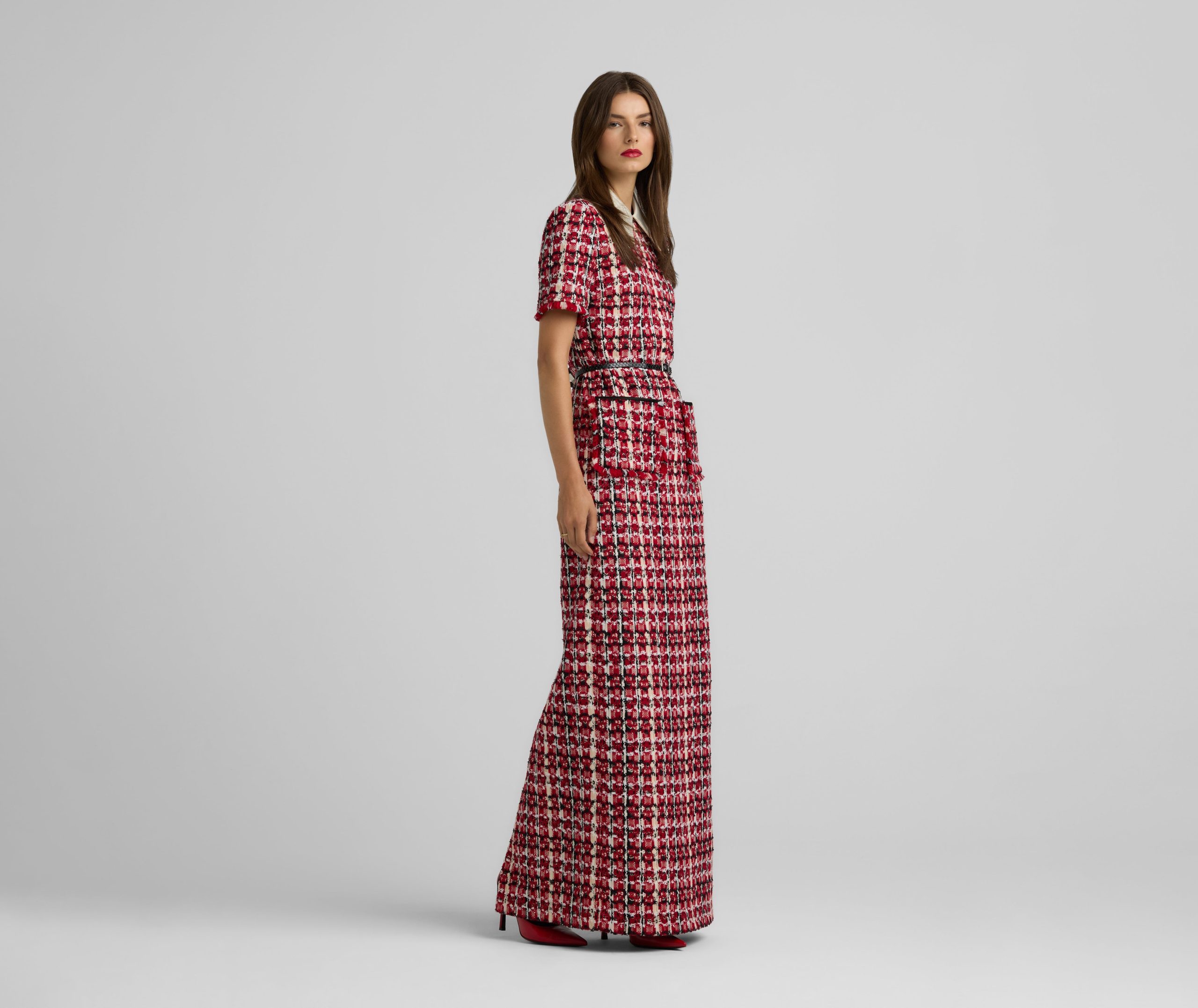 A soft plaid tweed knit dresses up for evening in this unique satin-collared short sleeve gown with patch pockets and a sophisticated straight skirt.