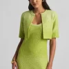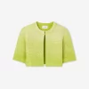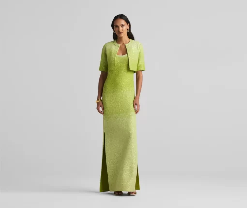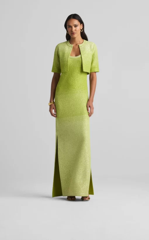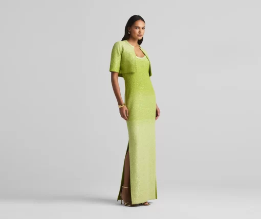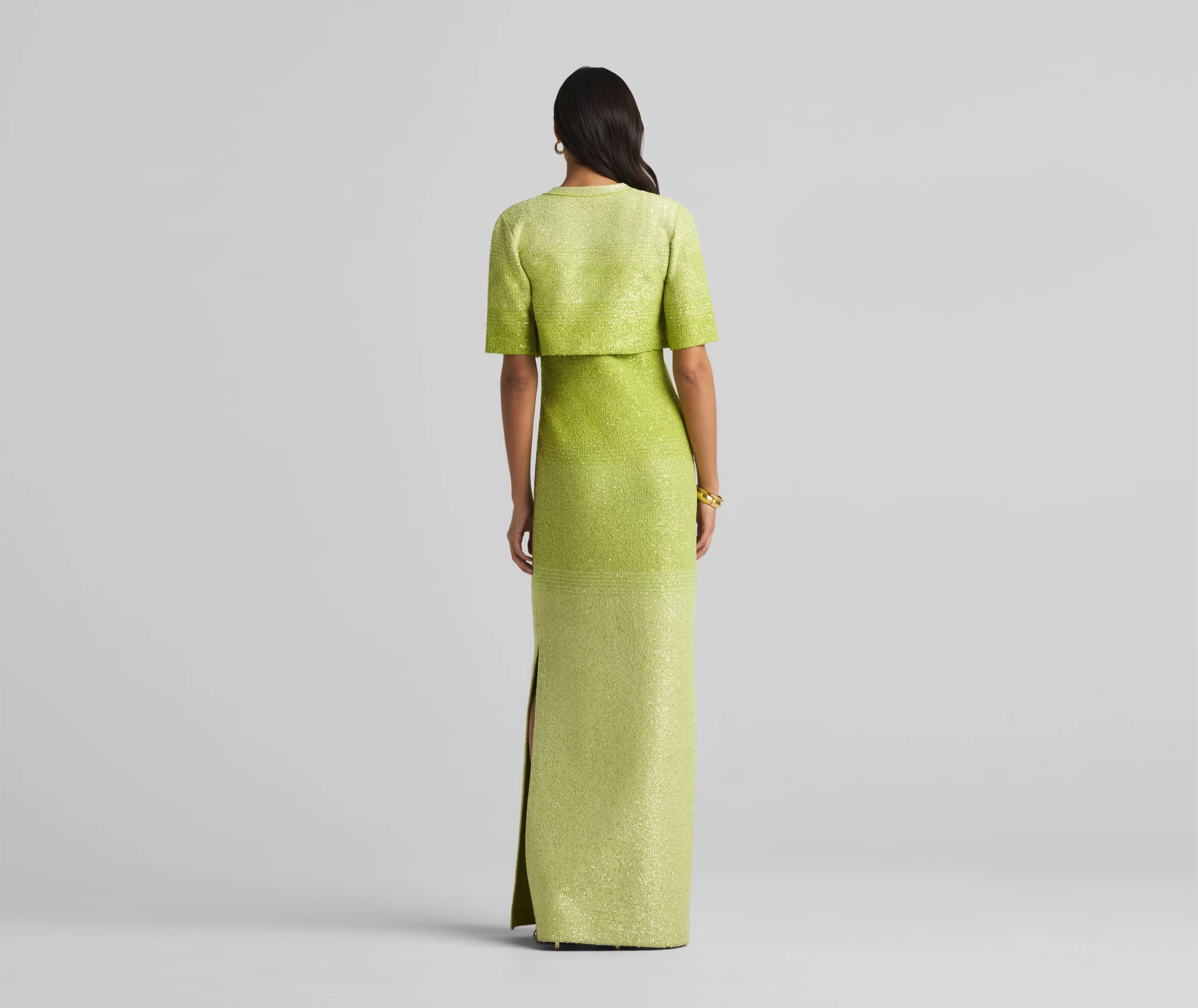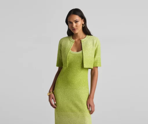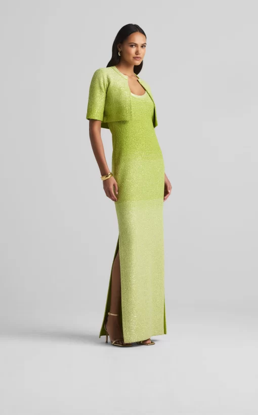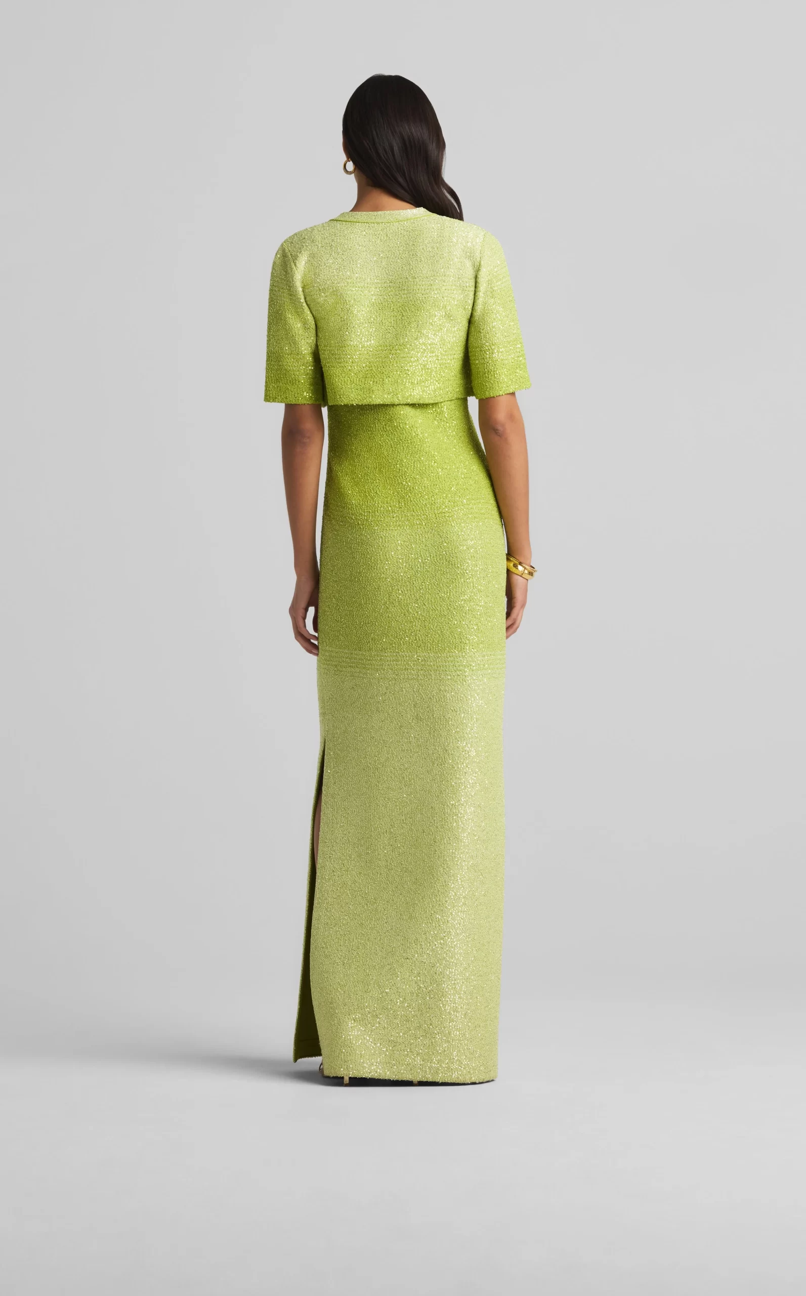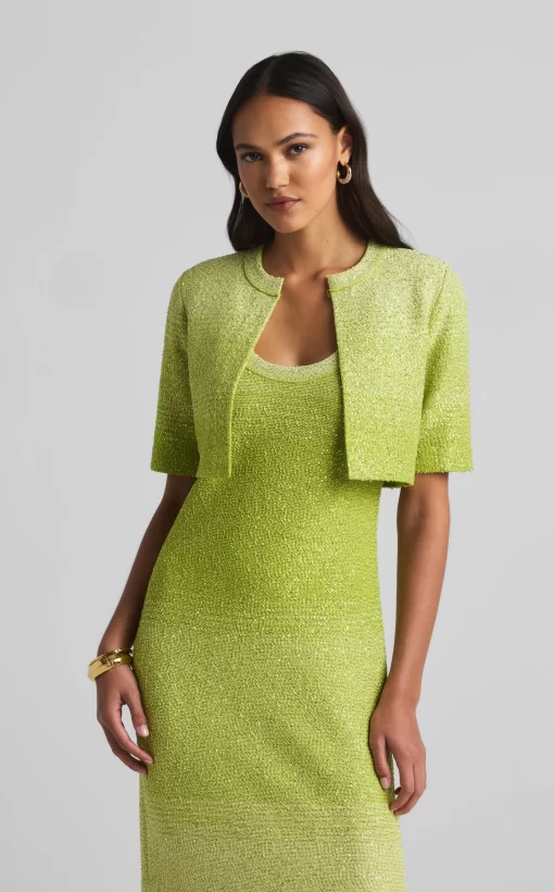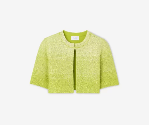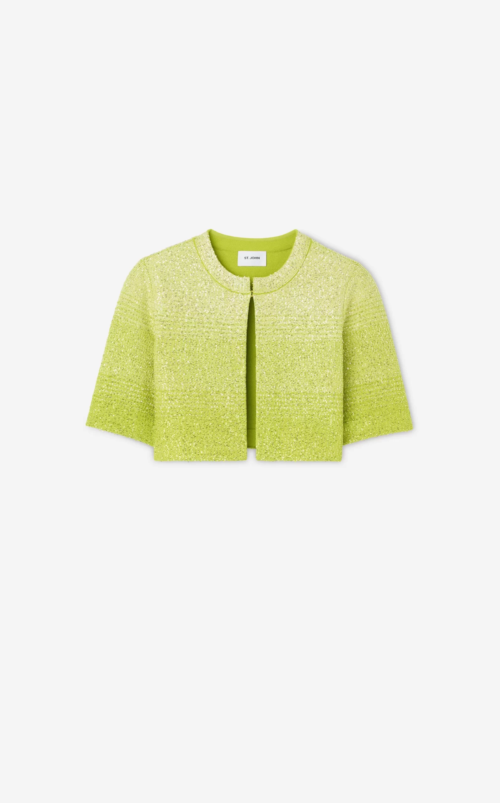This cropped short sleeve jacket is the perfect evening topper in a simple short sleeves style with degrade sequins in a striped ombré finish.