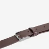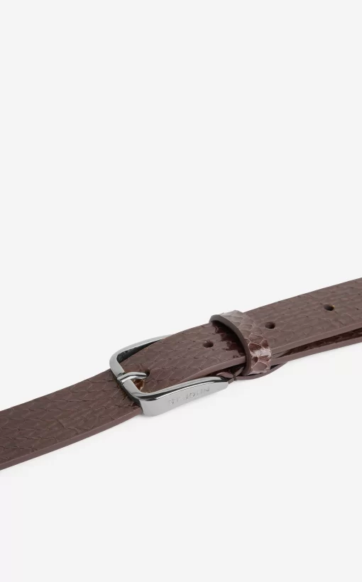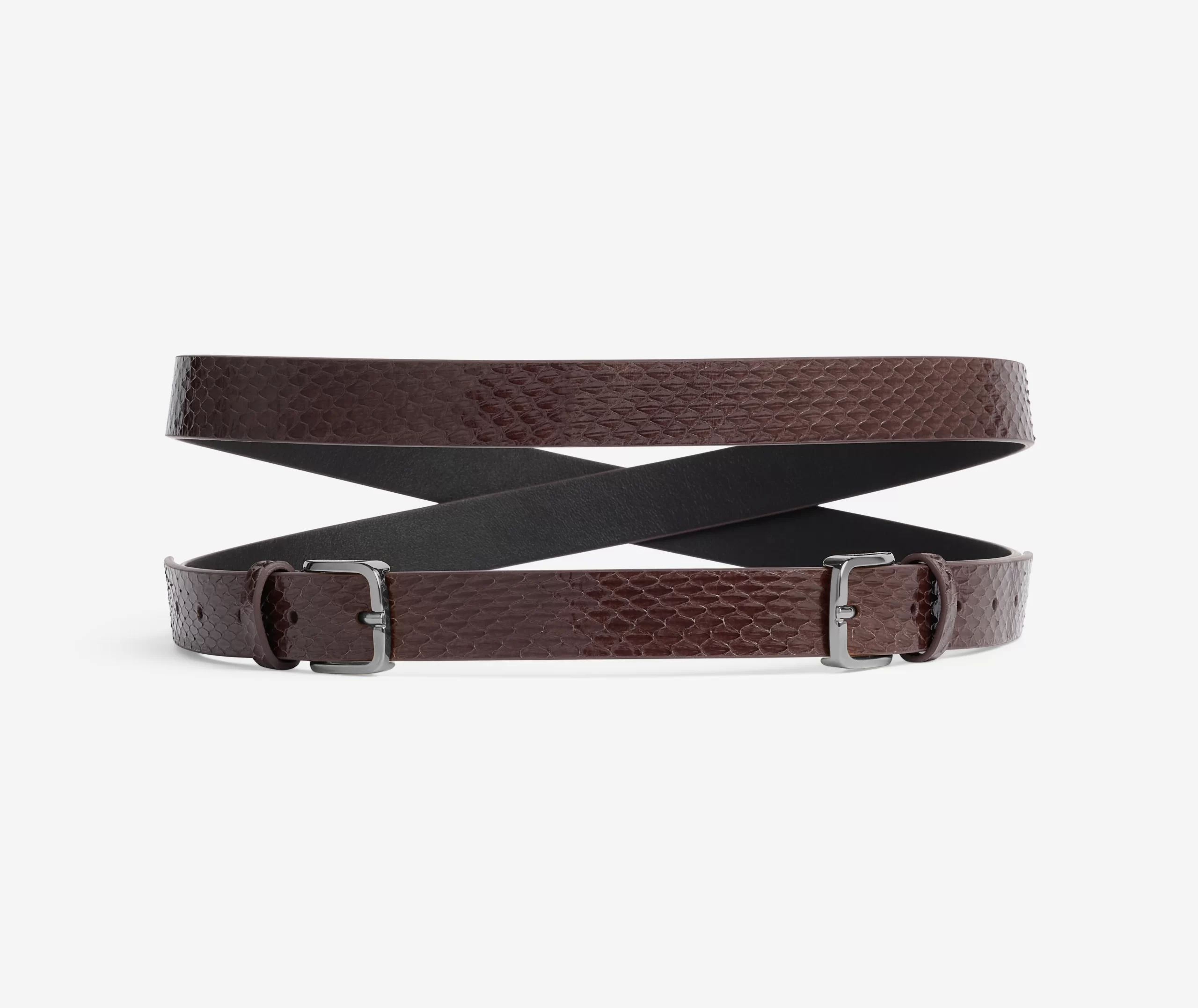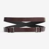 This mocha leather belt wraps twice around the waist, finishing with double buckles in gunmetal hardware for an update on a classic accessory.