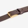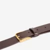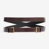 This mocha leather belt wraps twice around the waist, finishing with double buckles in gold hardware for an update on a classic accessory.