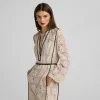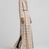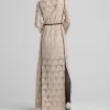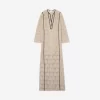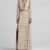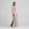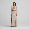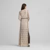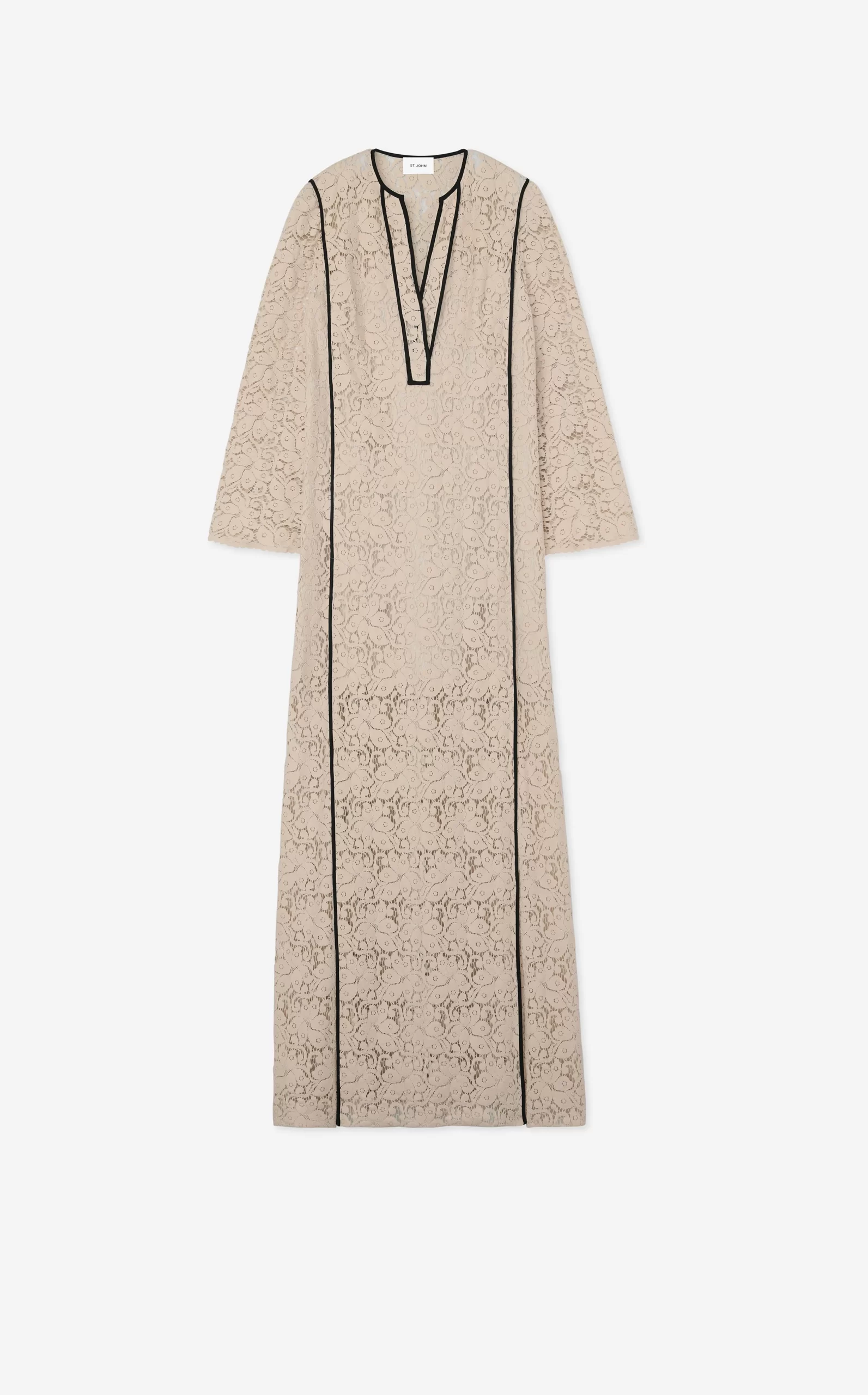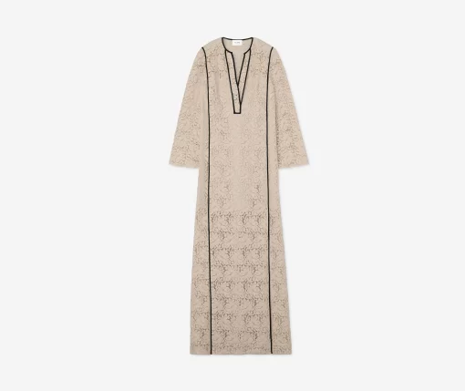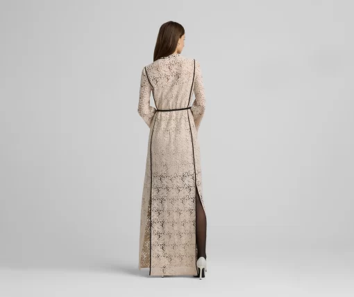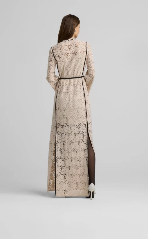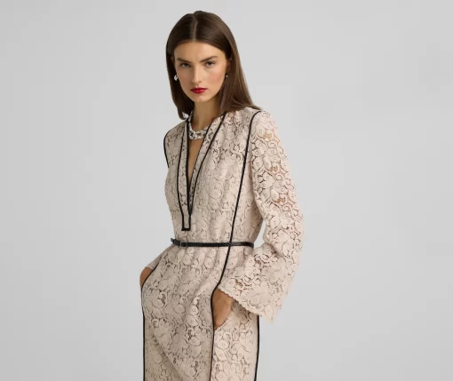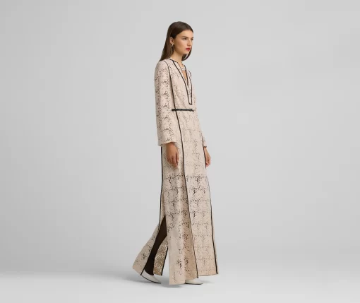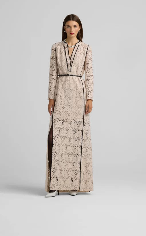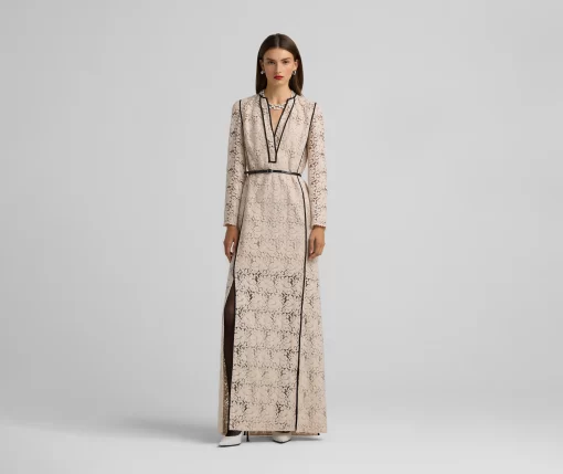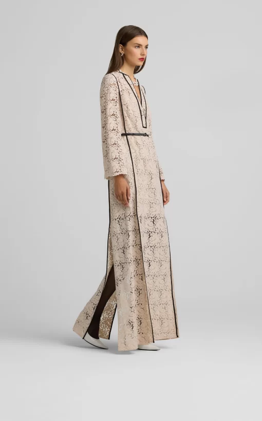 Lace takes a modern turn in cotton-blend guipure, in a long sleeve gown with contrast piping, slits, and a V-neck that bring personality to the piece.