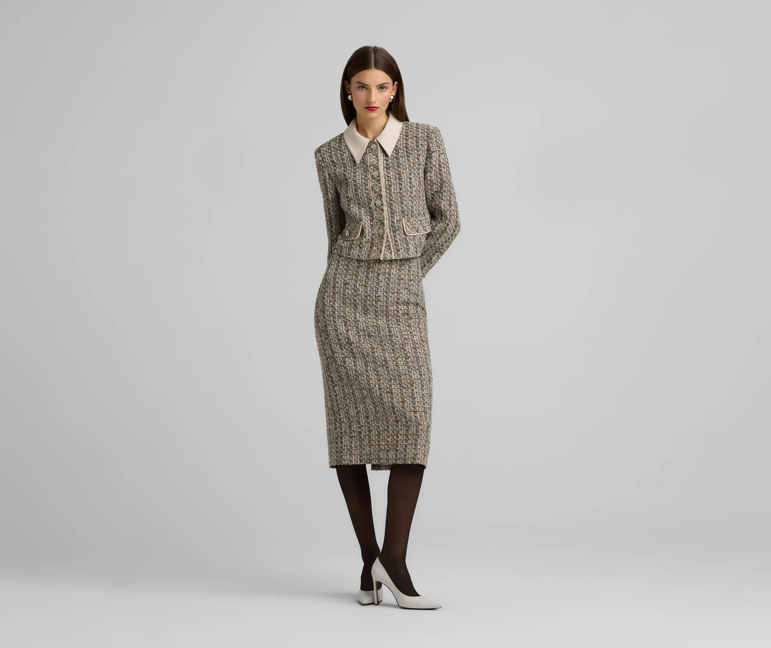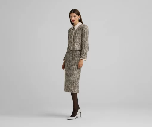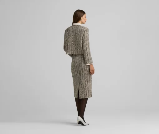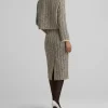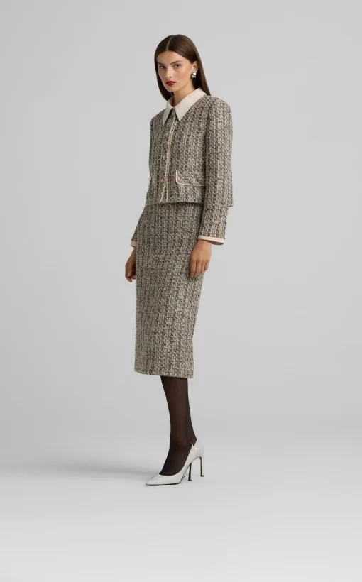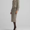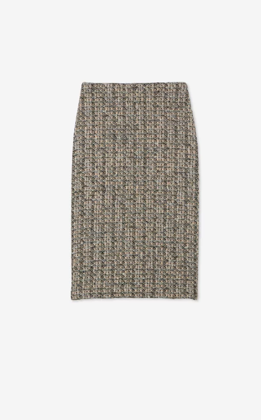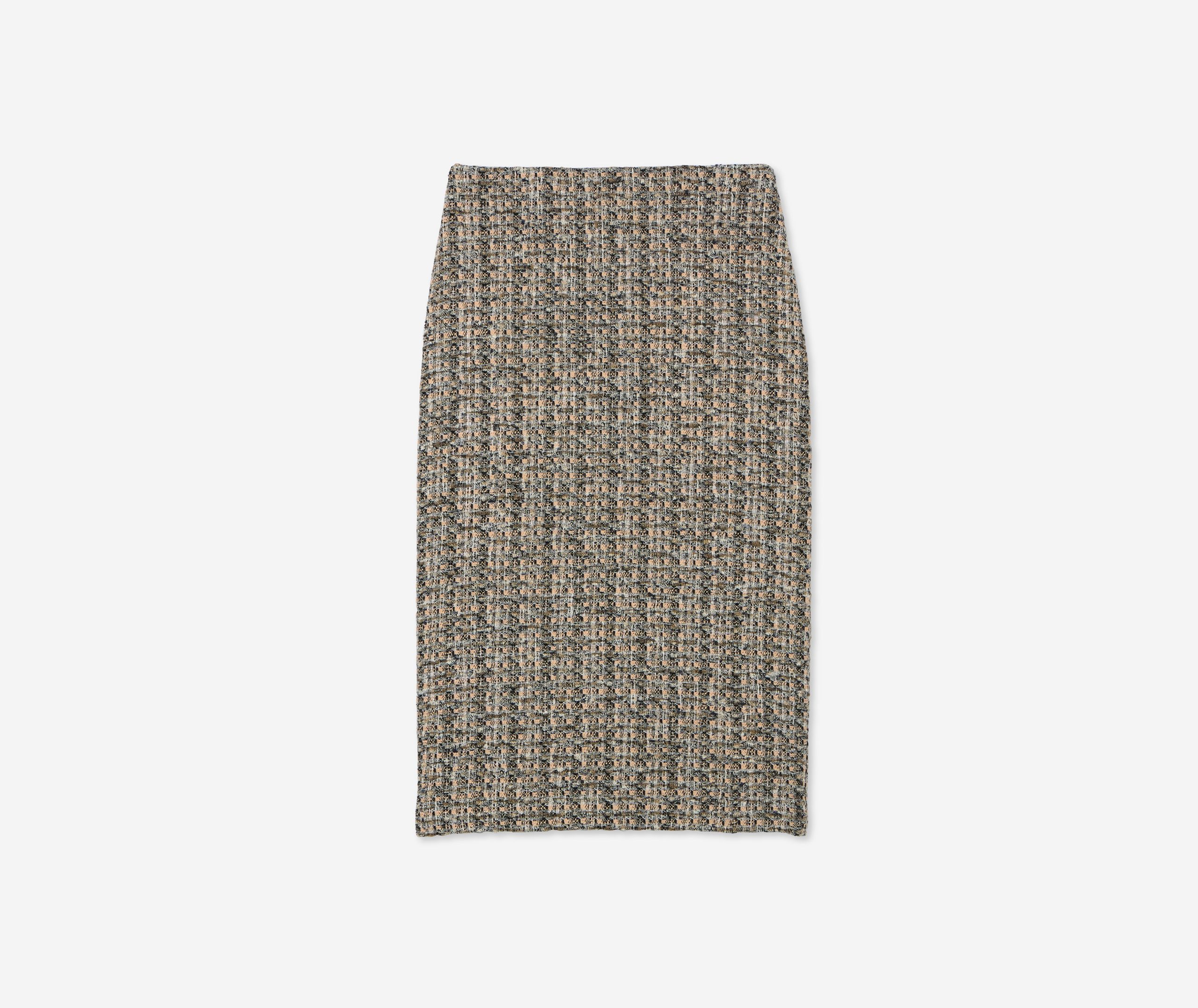 Metallic tweed collage knit brings texture to a pencil skirt, while a back slit offers ease of movement in this slim-cut style.