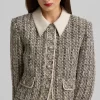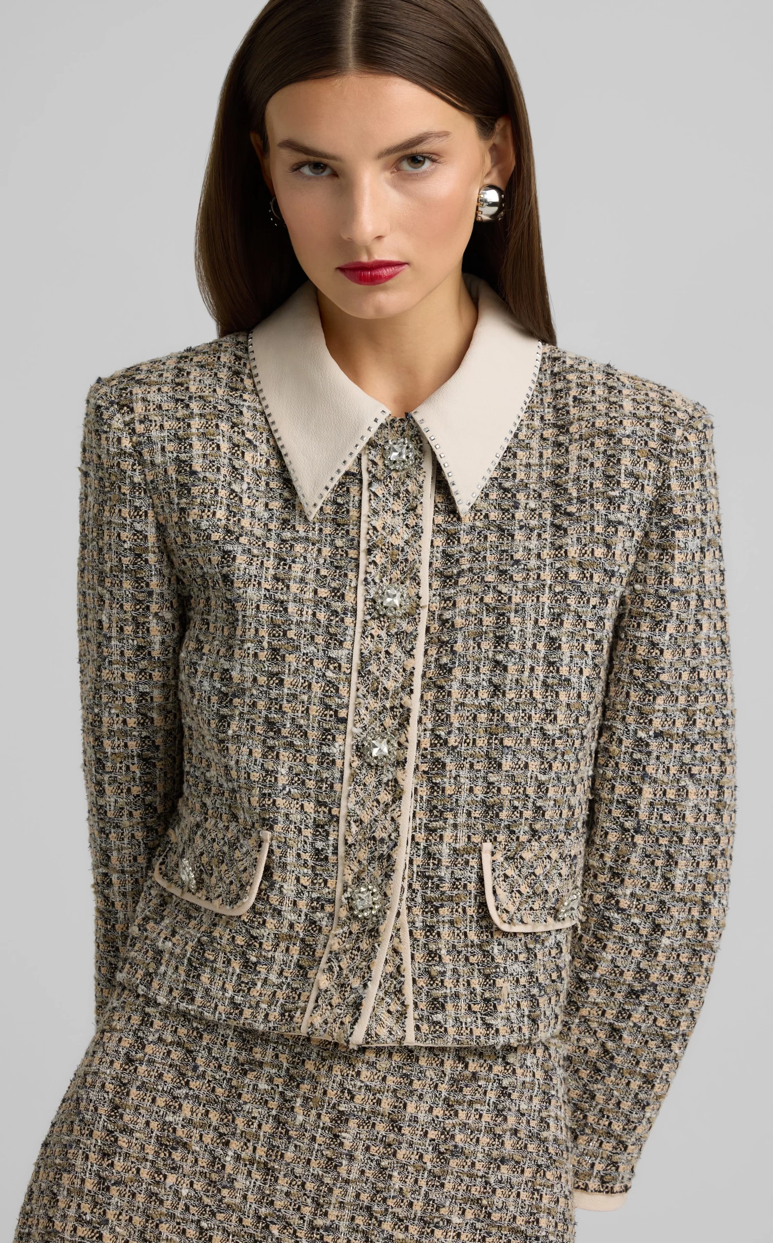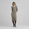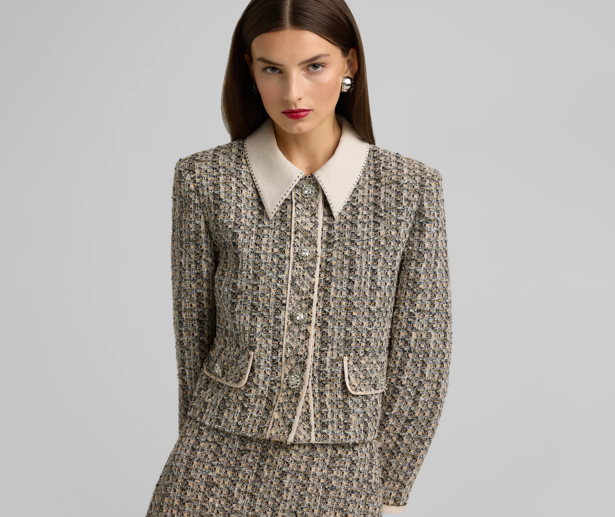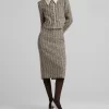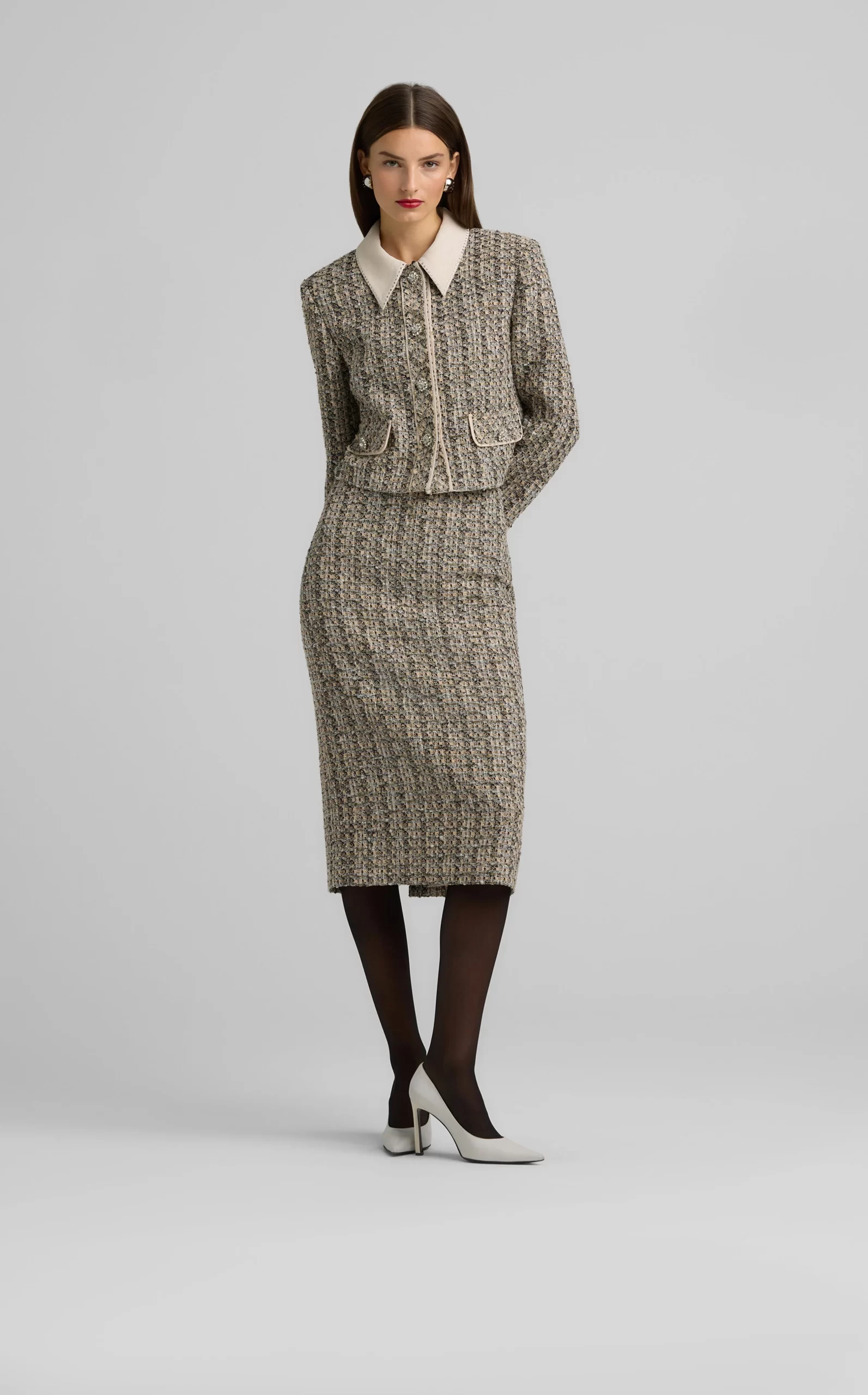 Metallic tweed collage knit brings texture to a pencil skirt, while a back slit offers ease of movement in this slim-cut style.