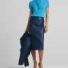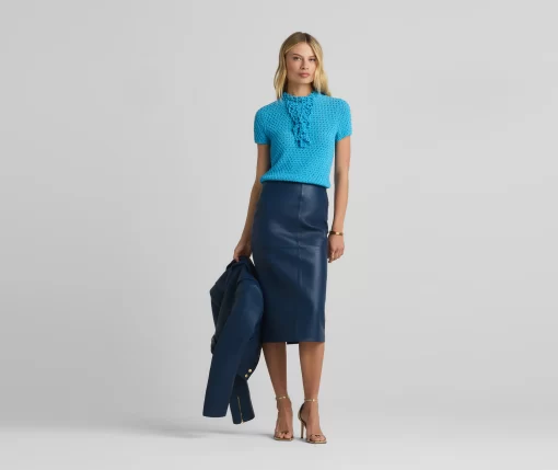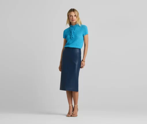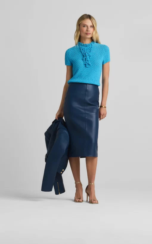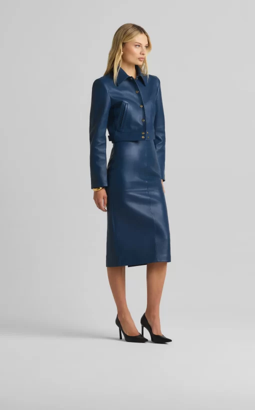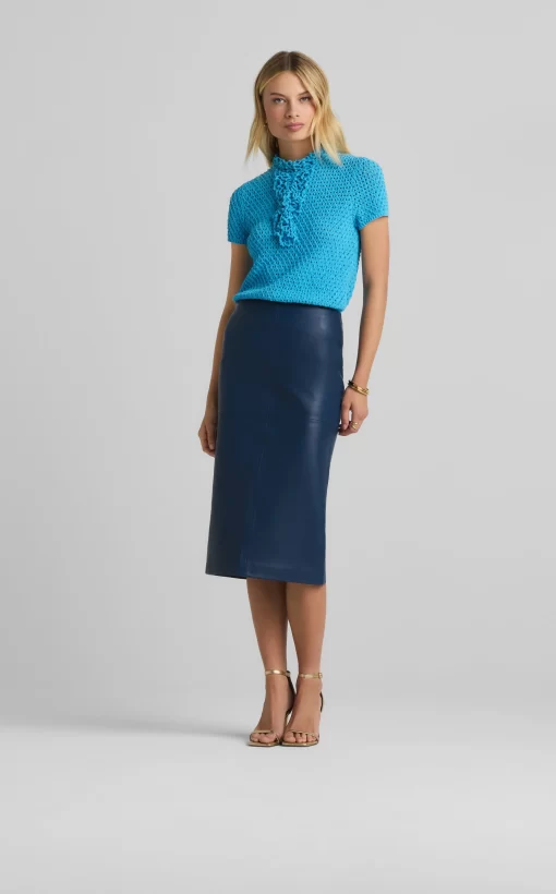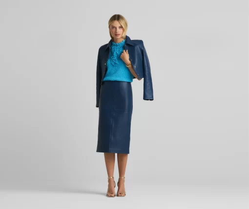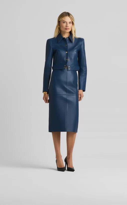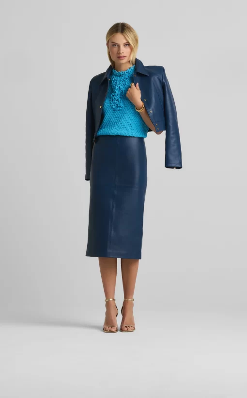 This vibrant double face leather skirt exudes luxury in its perfectly tailored simplicity and tonal seaming, making it a beautiful investment piece.