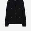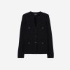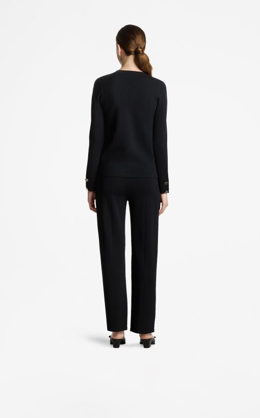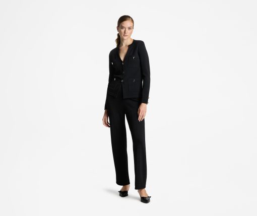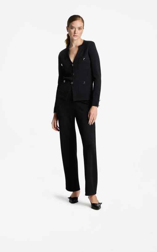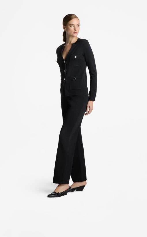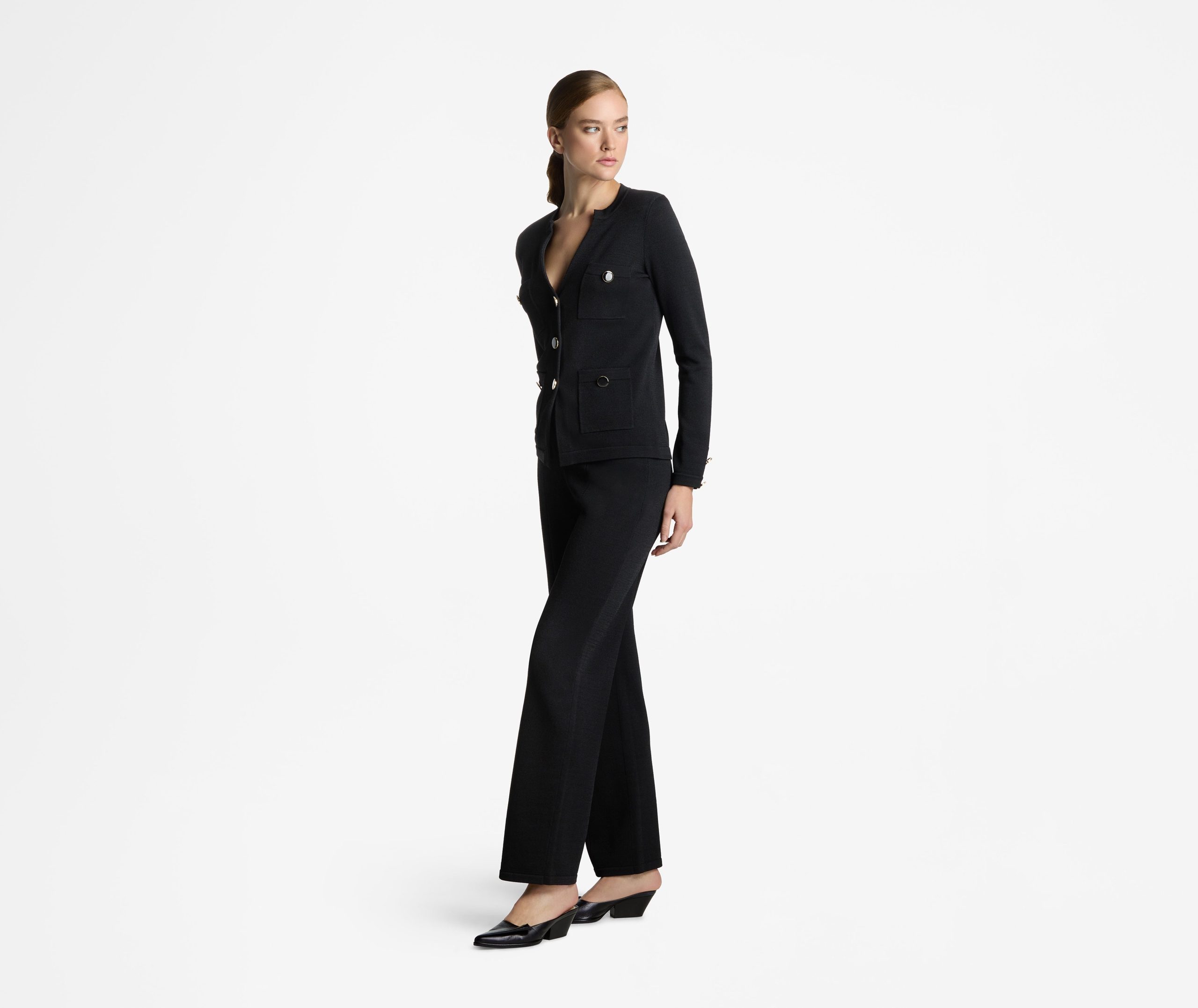 A modern neckline with an open V draws the eye to this chic Santiago Knit button front jacket, a luxurious knit that holds its shape through a lifetime of wear.
