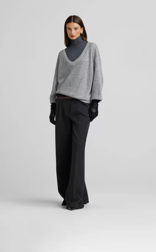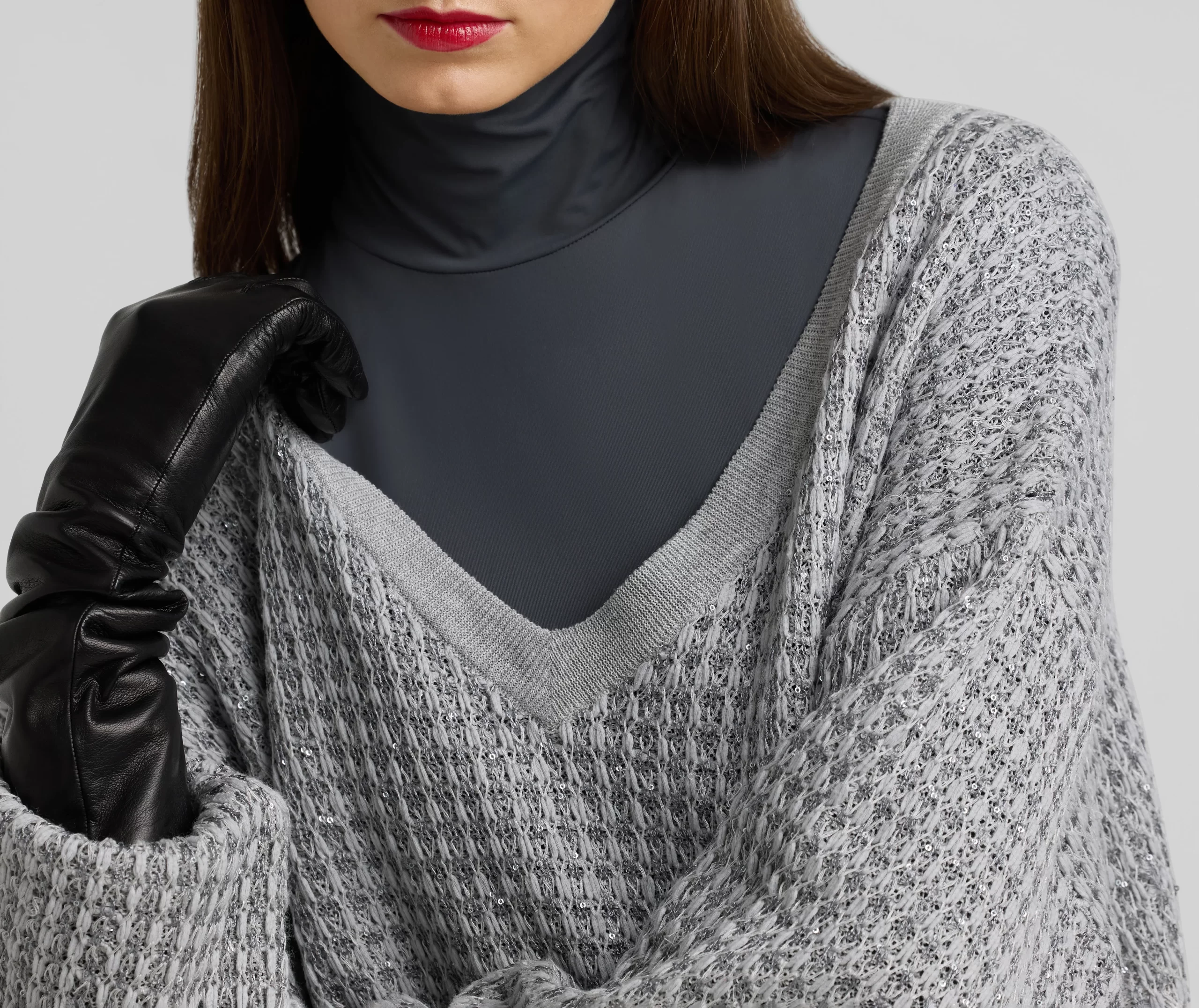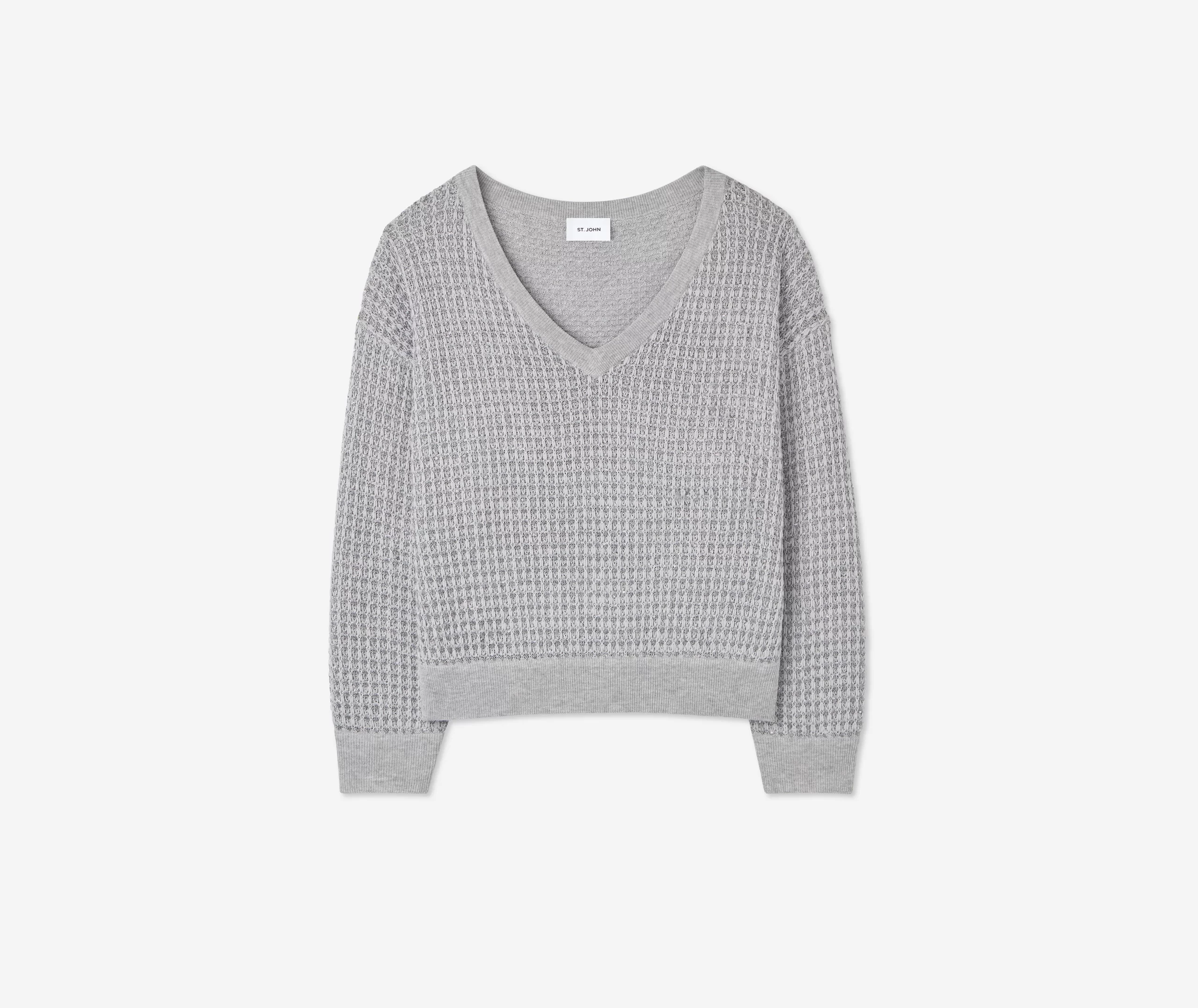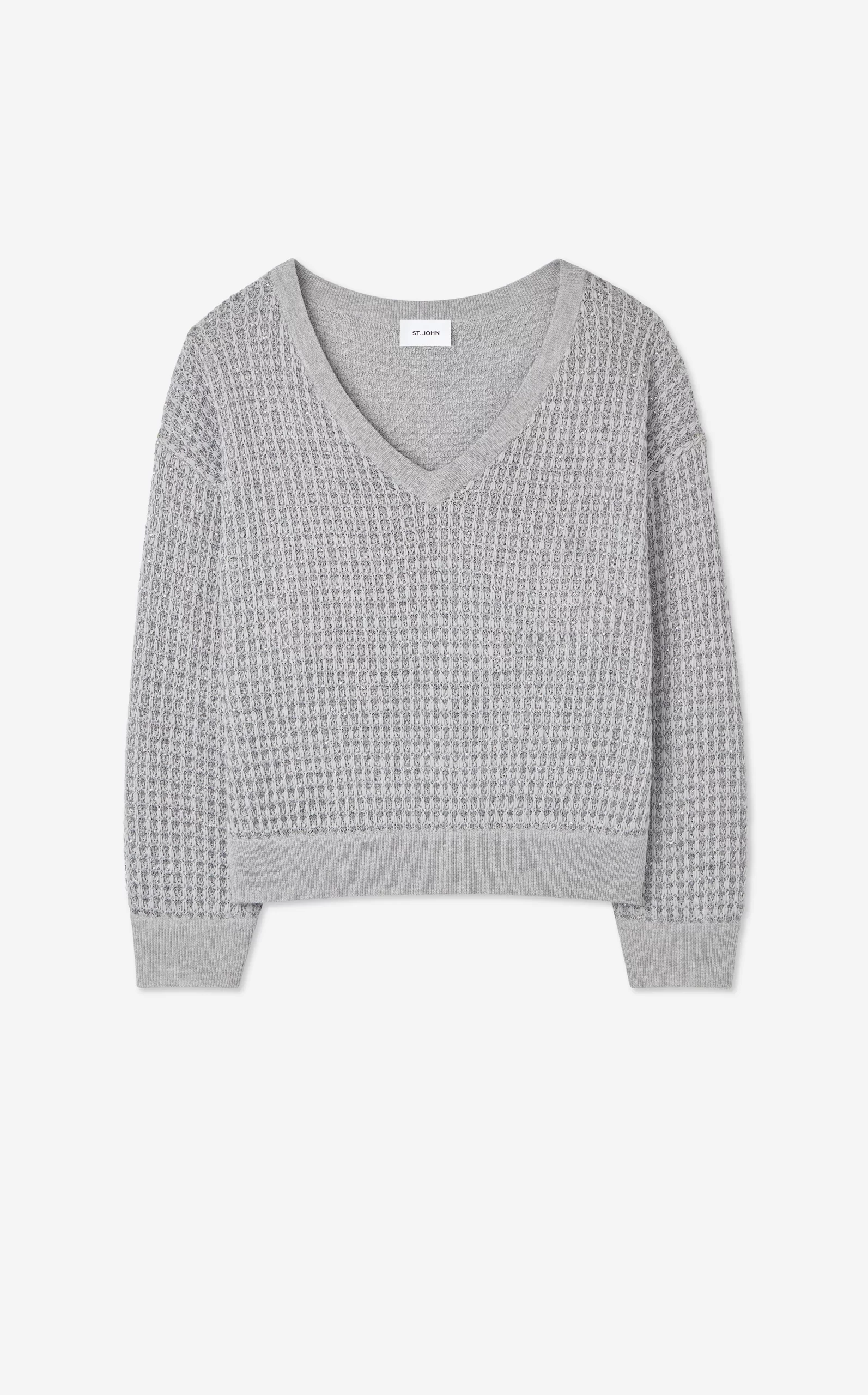 Sparkly sequins dress up a relaxed fit, textured V-neck sweater, a cozy and chic piece that elevates daytime wear and goes full glam for evening.