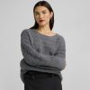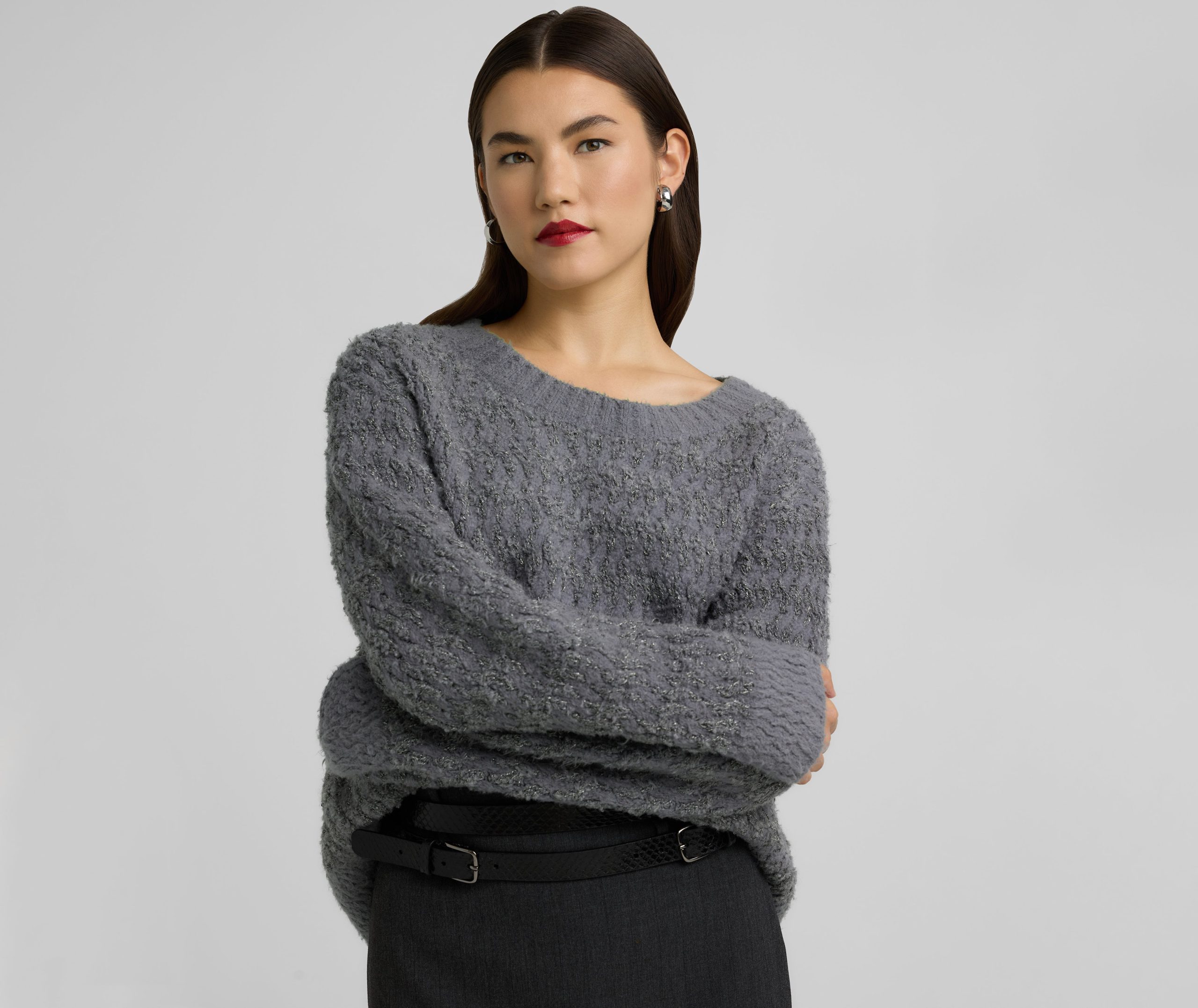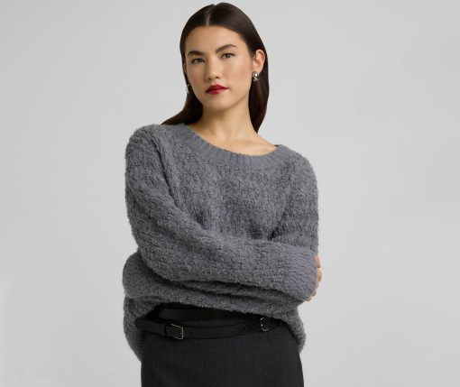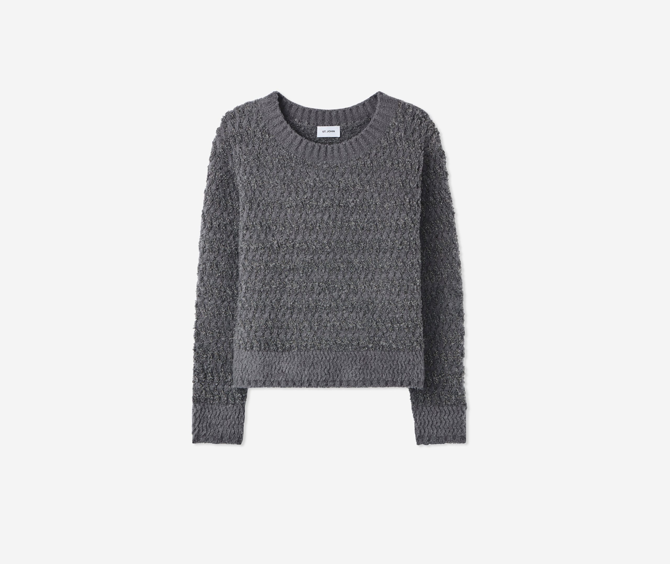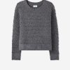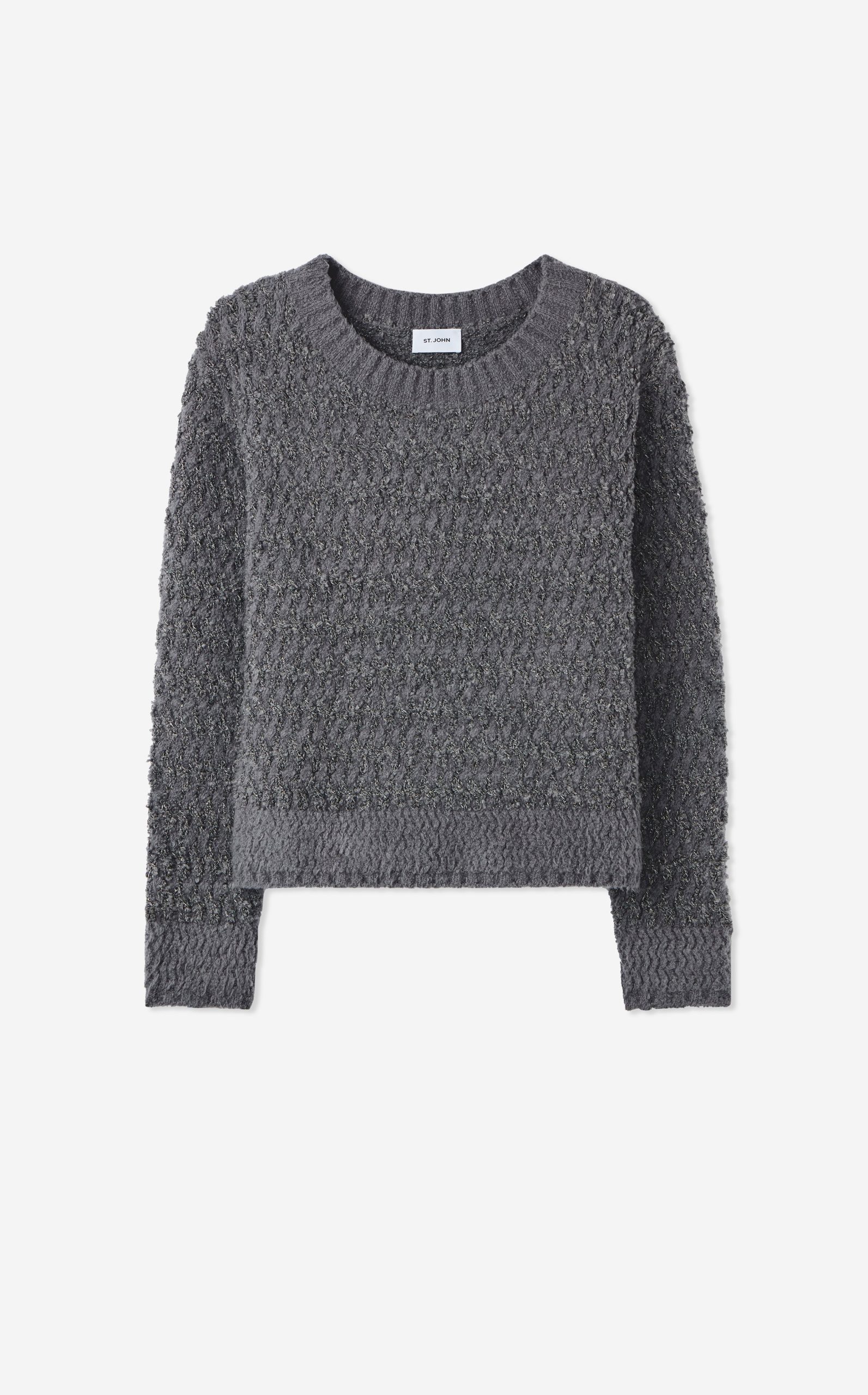 Two tones of grey threads emphasize the immaculate cable-knit texture woven into this cotton-blend crewneck sweater, a cozy, chunky staple.