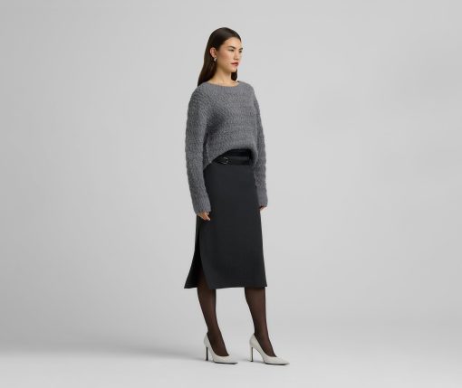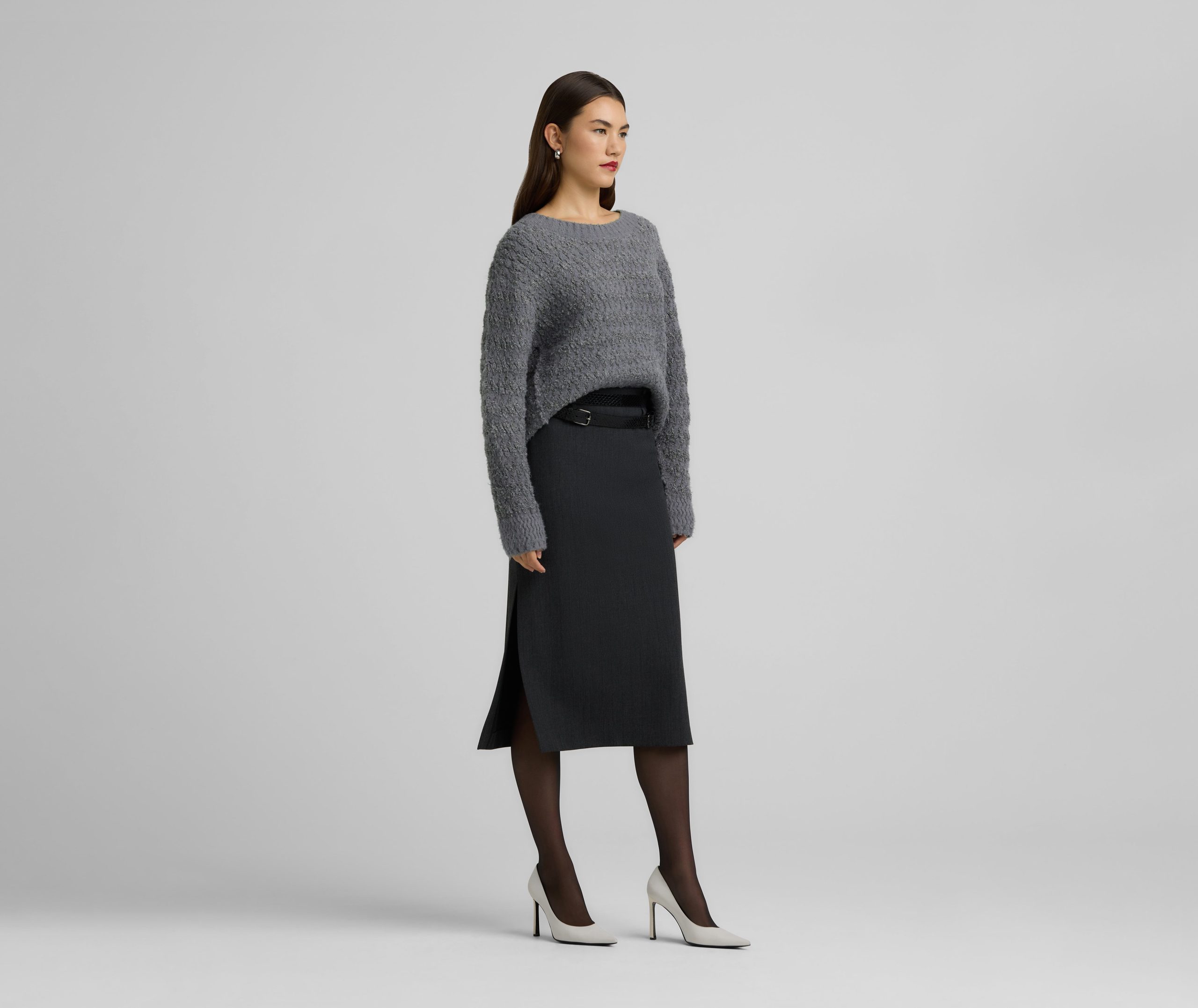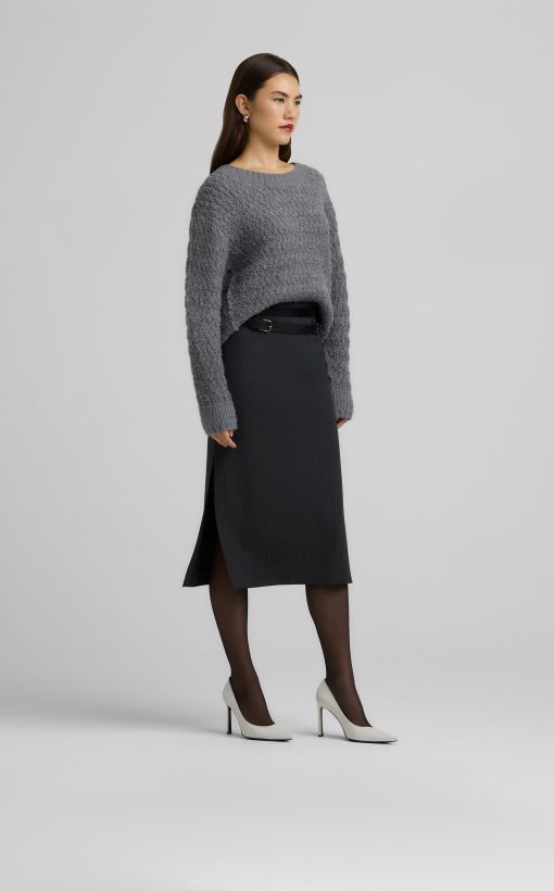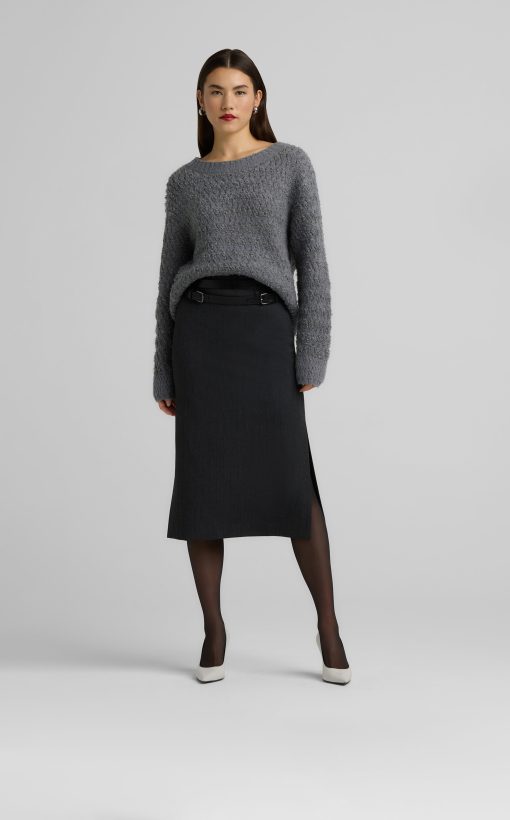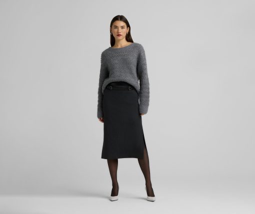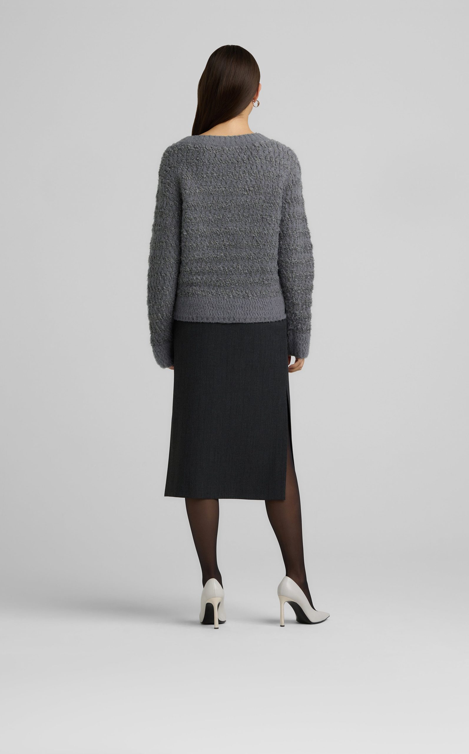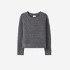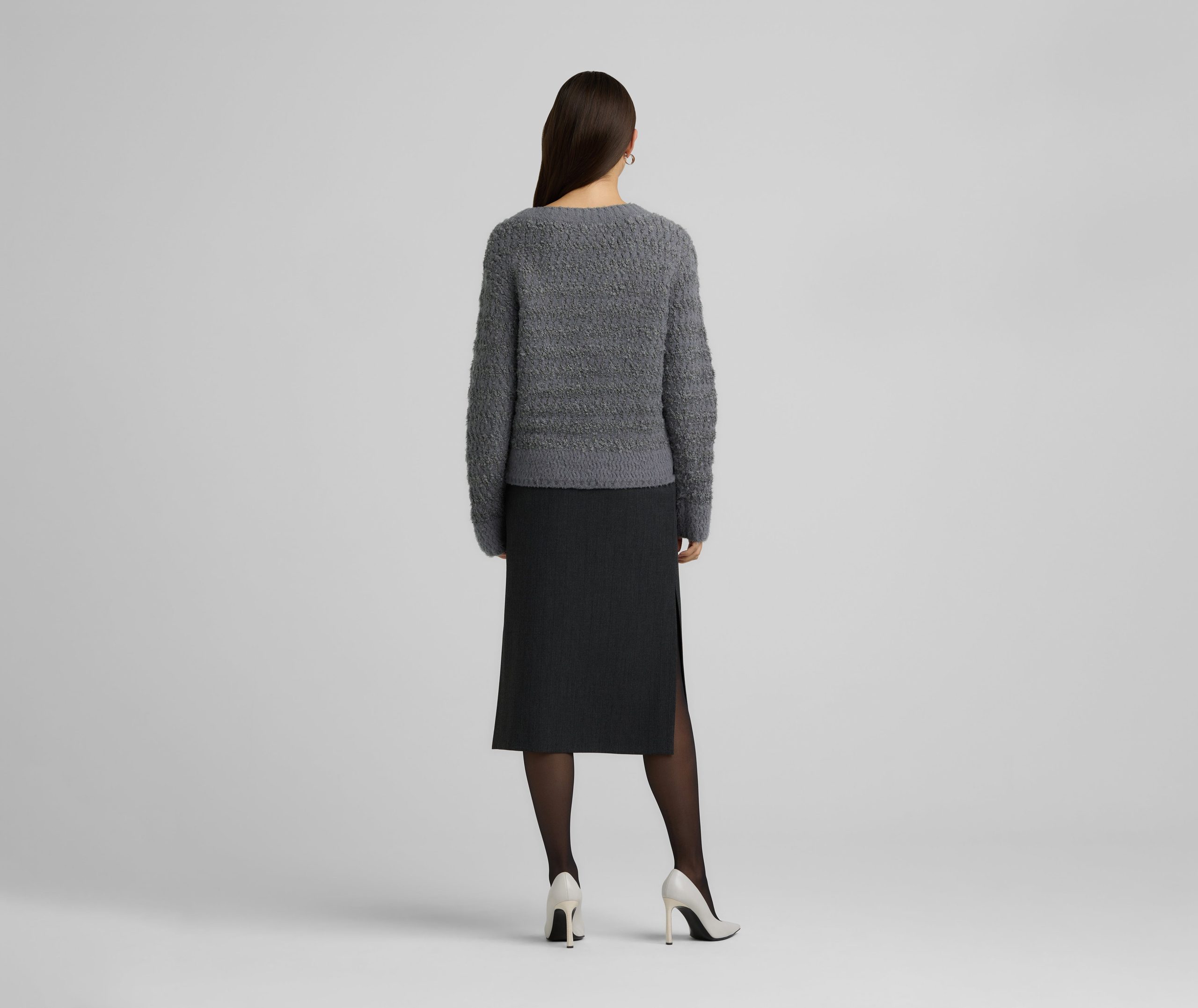 Two tones of grey threads emphasize the immaculate cable-knit texture woven into this cotton-blend crewneck sweater, a cozy, chunky staple.