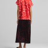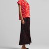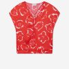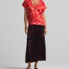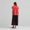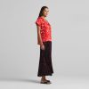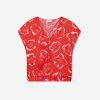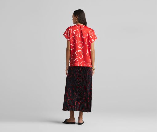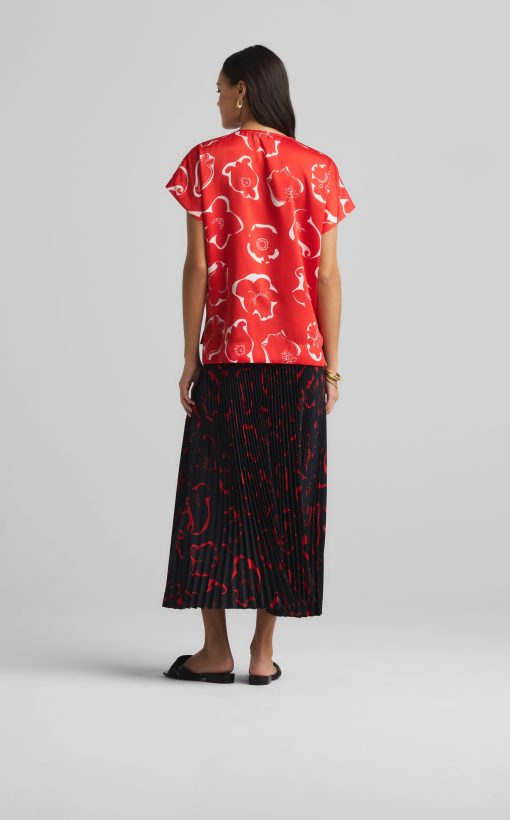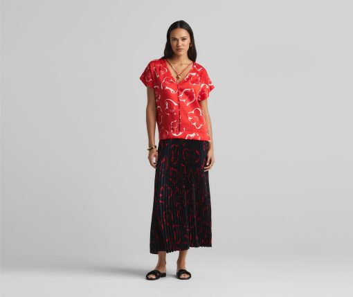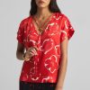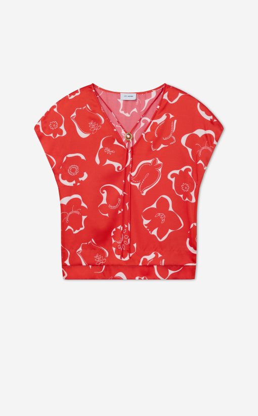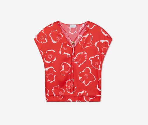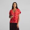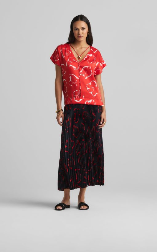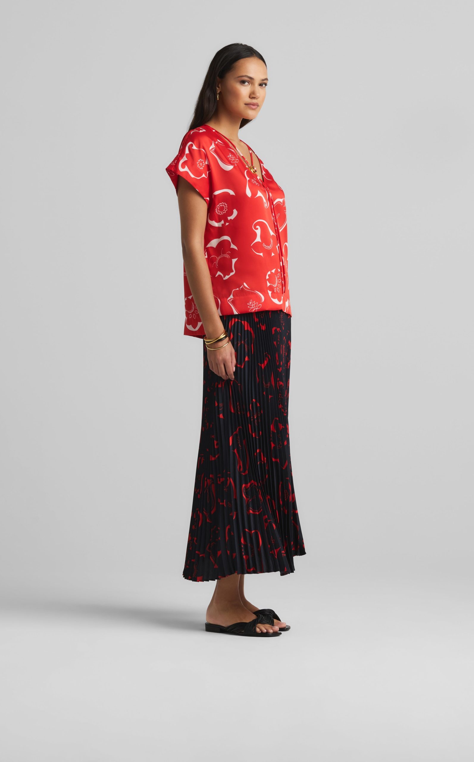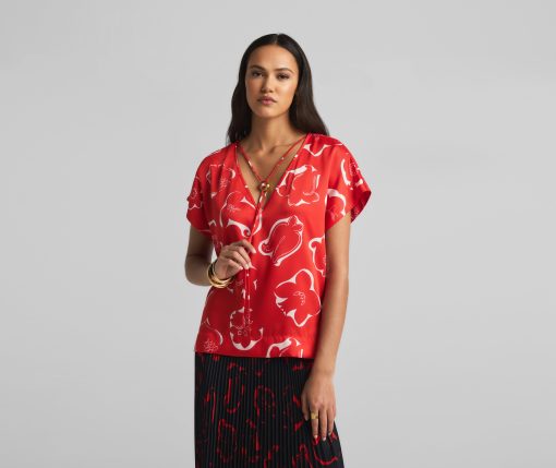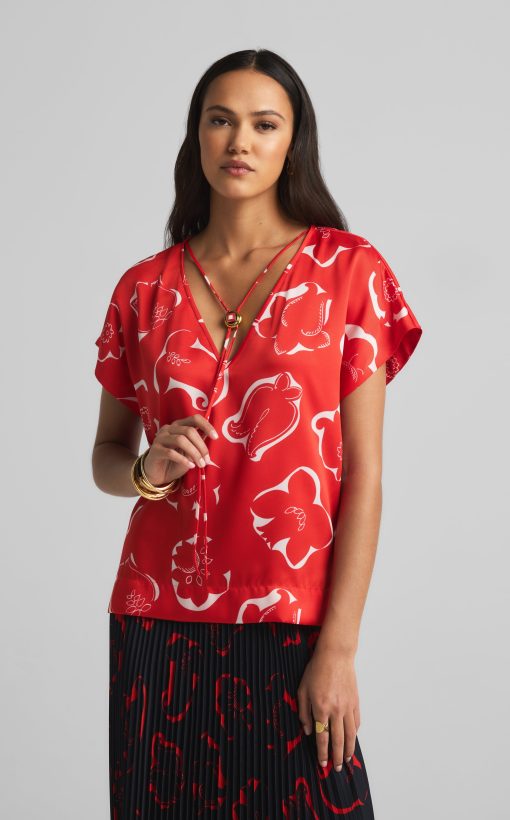 A 1950s-inspired floral print pops in this short sleeve V-neck blouse with a bolo neck detail and luxe gold hardware.